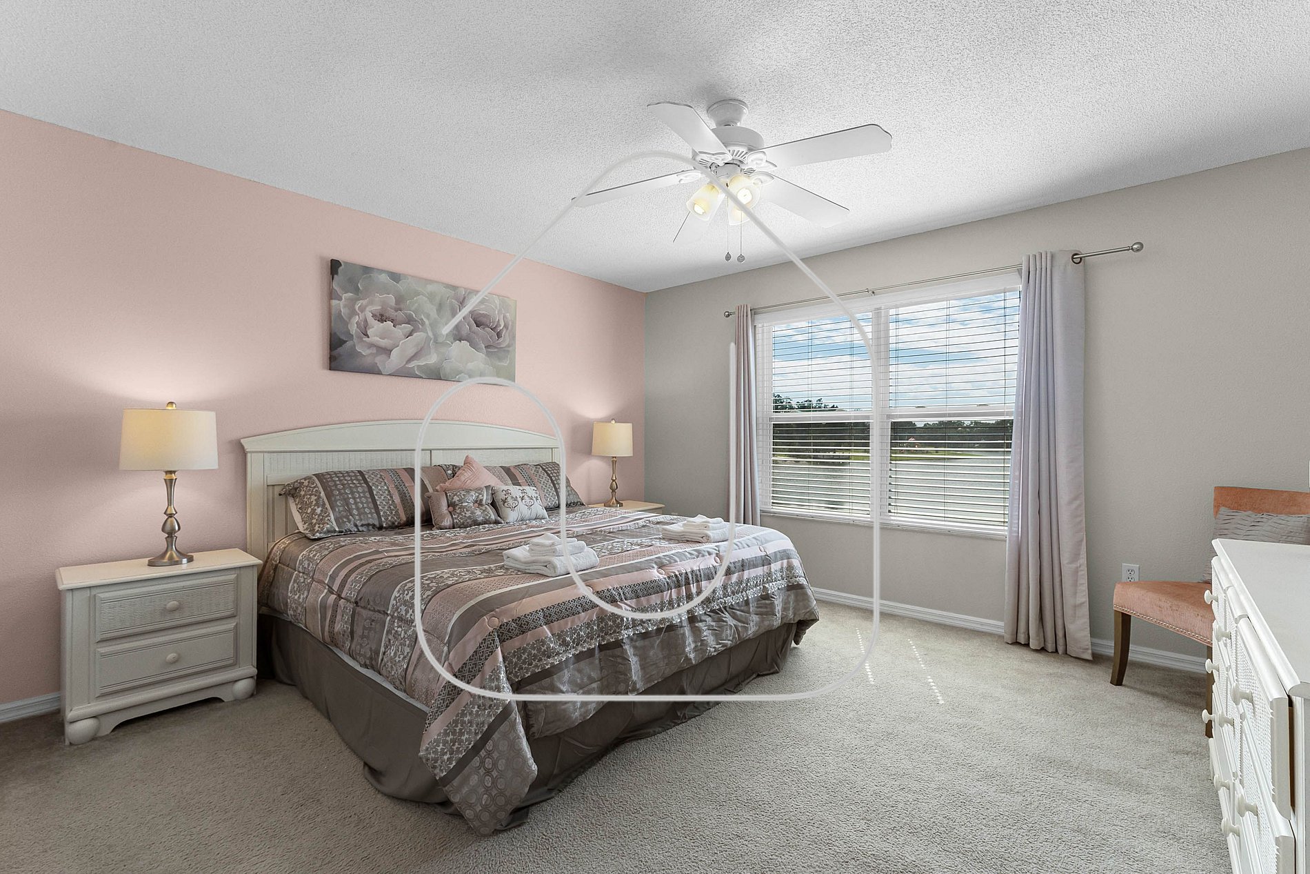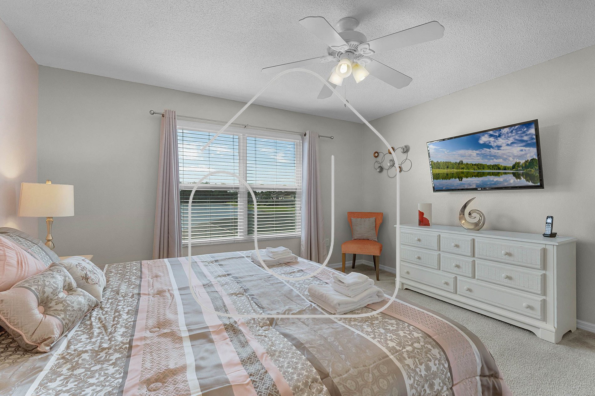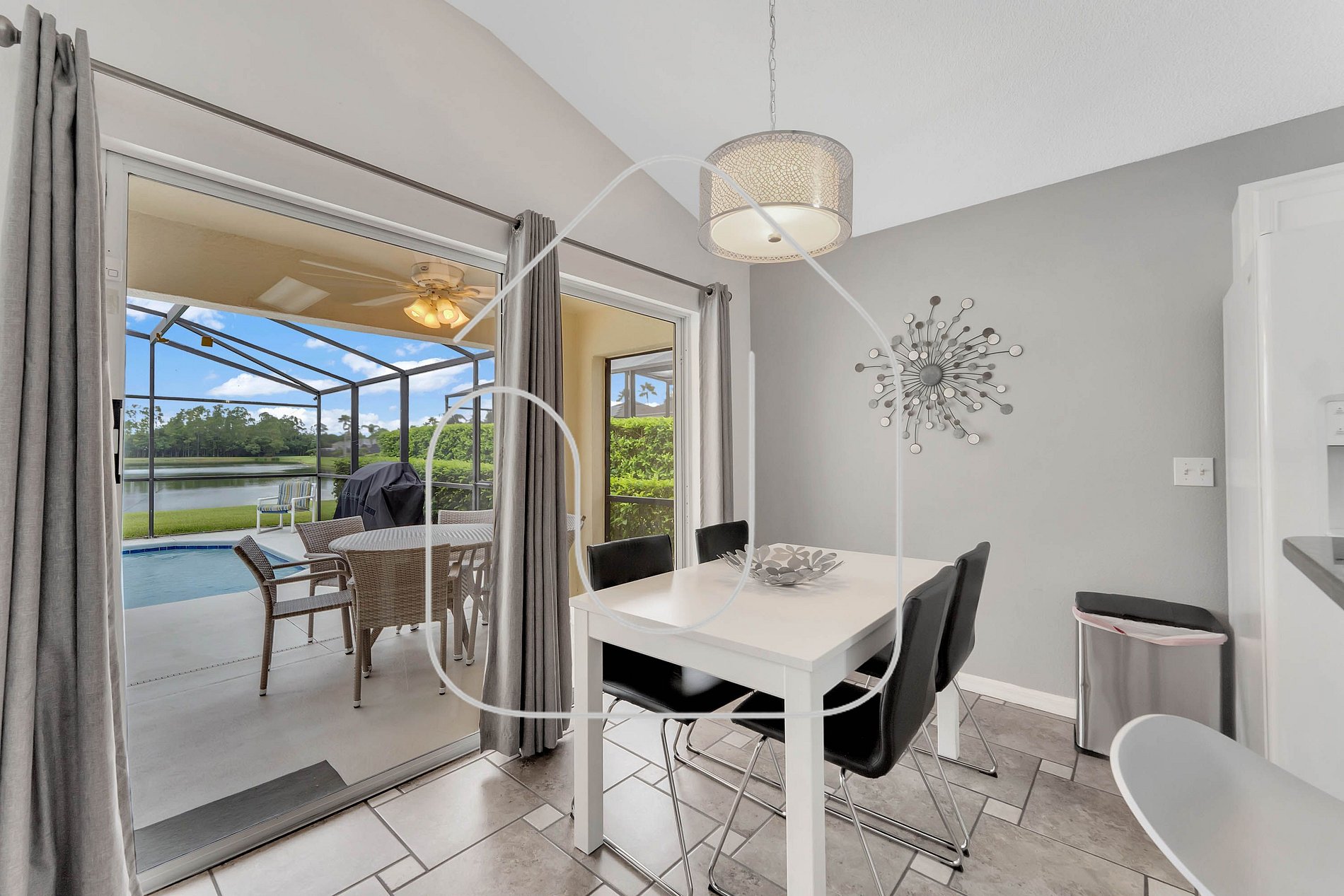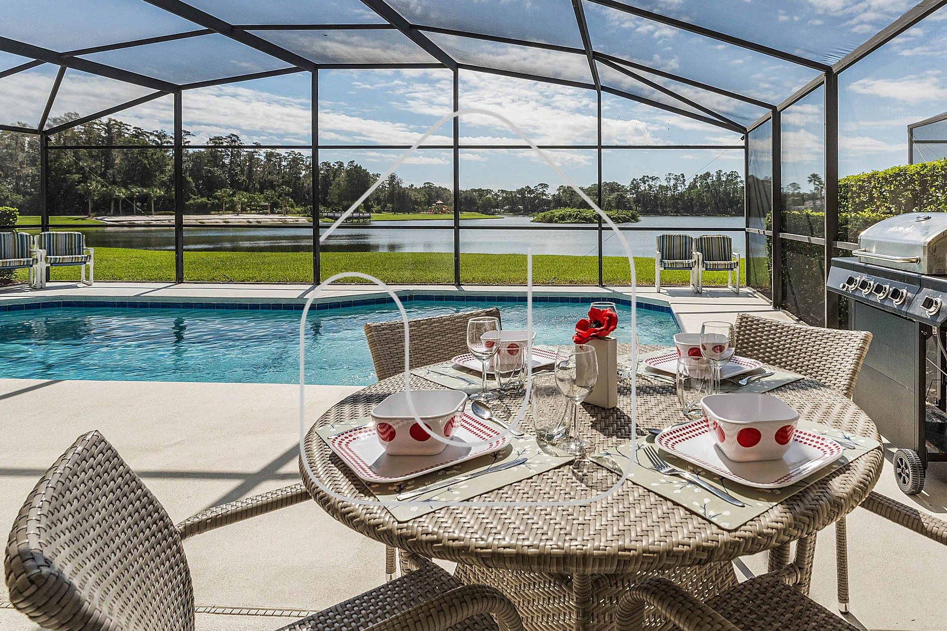 Discover your perfect getaway in this spacious 5‑bedroom, 3‑bath home overlooking the lake in a gated resort community. Enjoy a screened lanai and private heated pool, fully equipped kitchen, in‑unit washer/dryer, unlimited high‑speed Wi‑Fi, and easy self‑check‑in. Just 20 minutes from Disney and close to shopping and all major parks. Parking for up to 2 cars. Pool heating and BBQ options available for a fee.