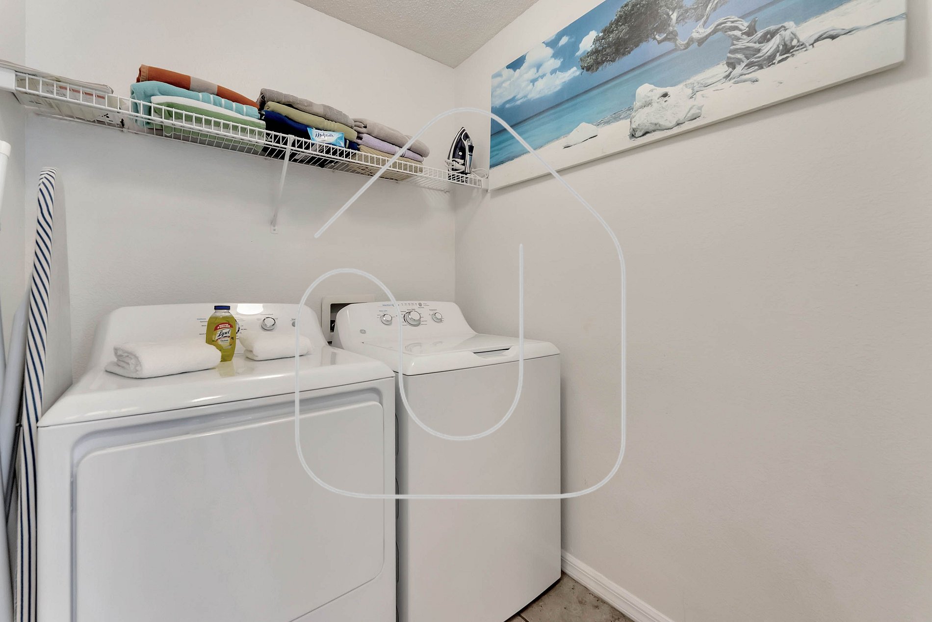 The fully equipped kitchen is ideal for preparing family meals, while the adjacent laundry room offers a washer, dryer, iron, and ironing board—no extra fees.