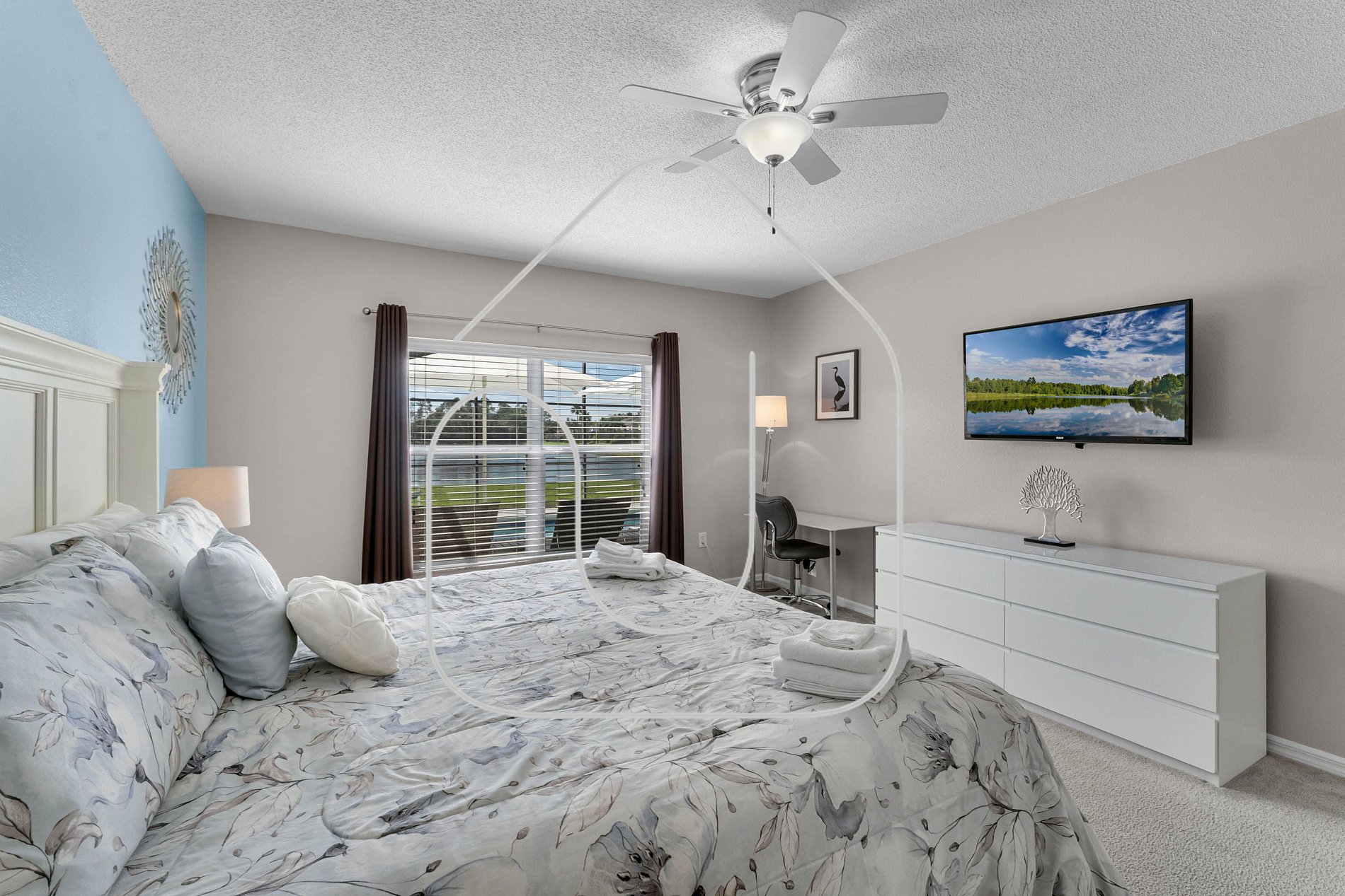 Master Suite (ground floor): King bed, 32‑in TV, closet, and private bathroom with walk‑in shower.