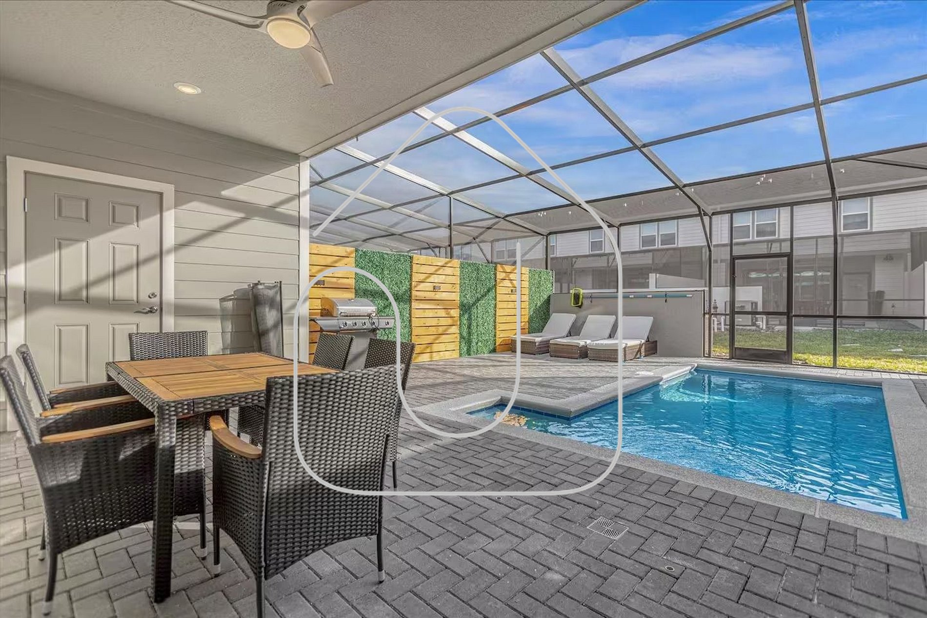 • Private screened pool with lounge chairs and child safety fence