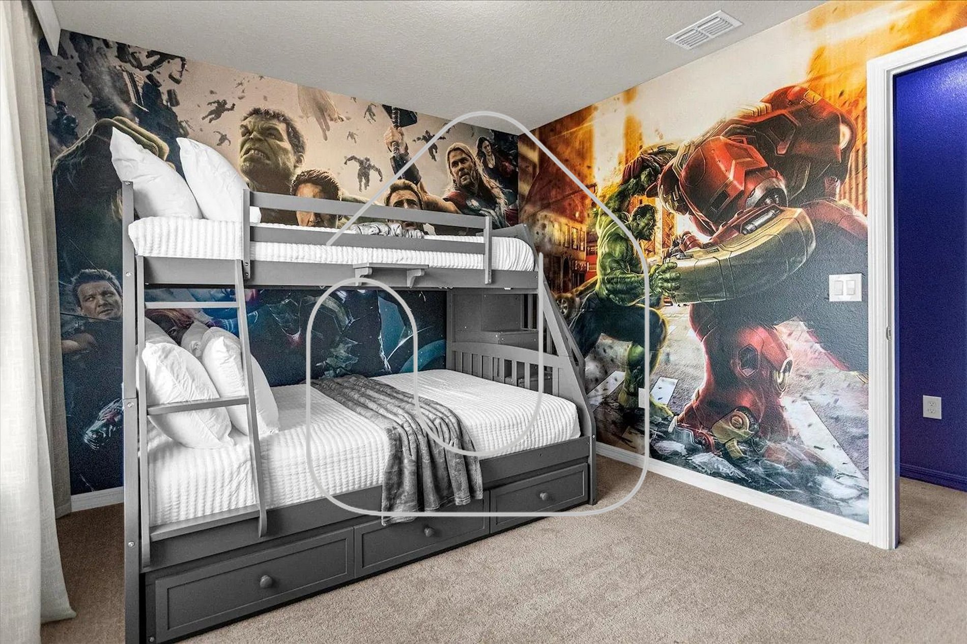 • Two fun Disney-themed rooms with bunk beds (Mickey & Marvel Avengers) - upstairs
