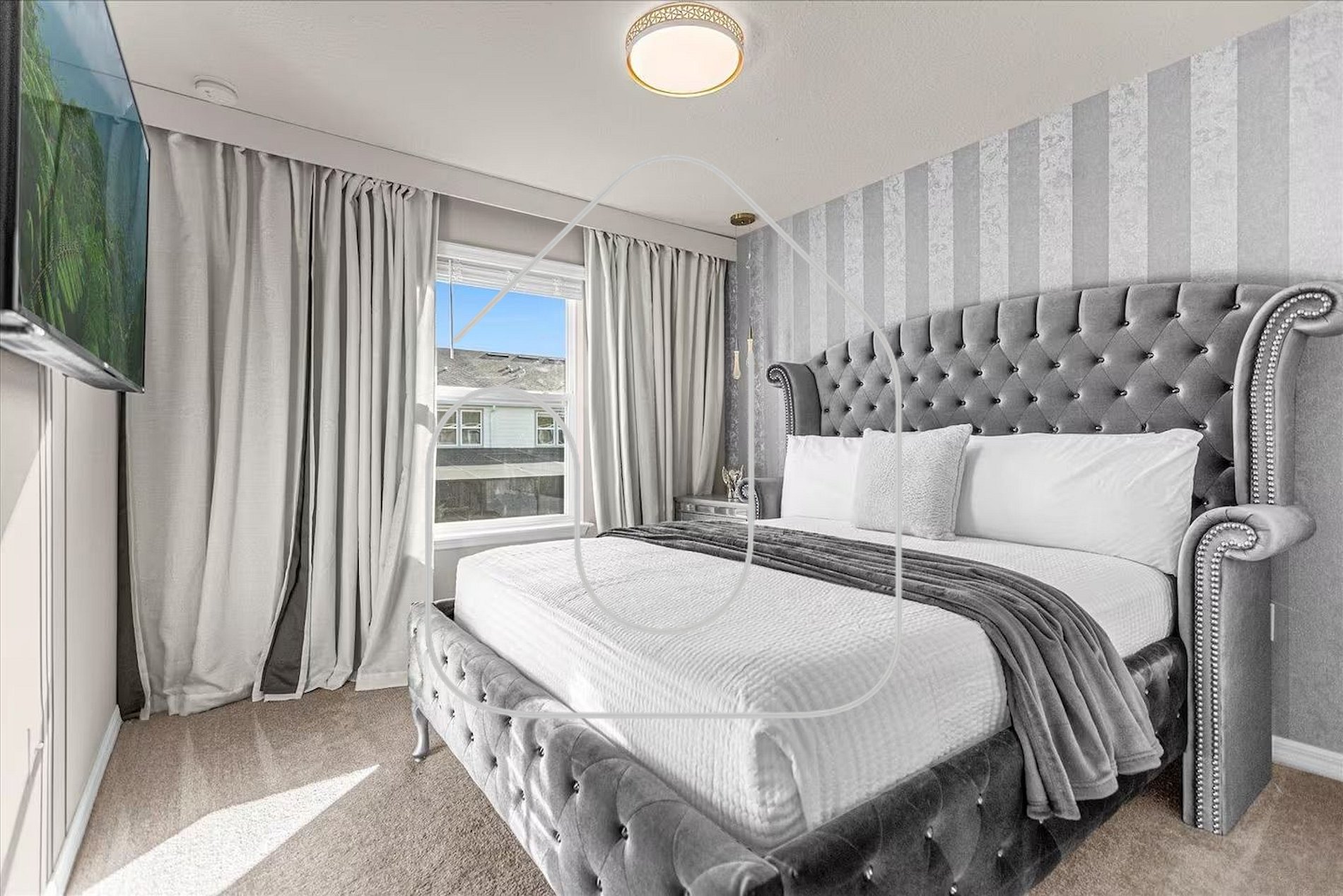 • Spacious living room with modern décor and a giant smart TV
