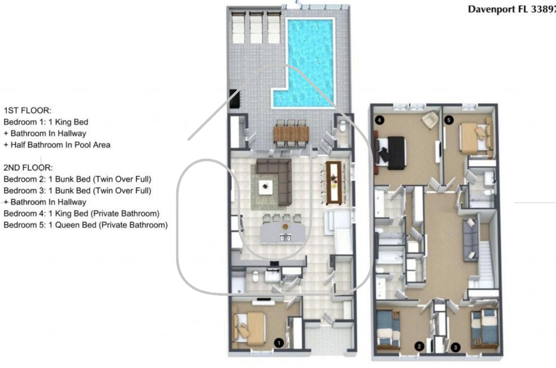 This stunning 5-bedroom, 5-bathroom townhouse in the Windsor Island Resort combines luxury, comfort, and fun for the whole family. Designed with style and entertainment in mind, the home features themed bedrooms, a private pool, and a fully equipped kitchen, offering the perfect home base for your Florida vacation.