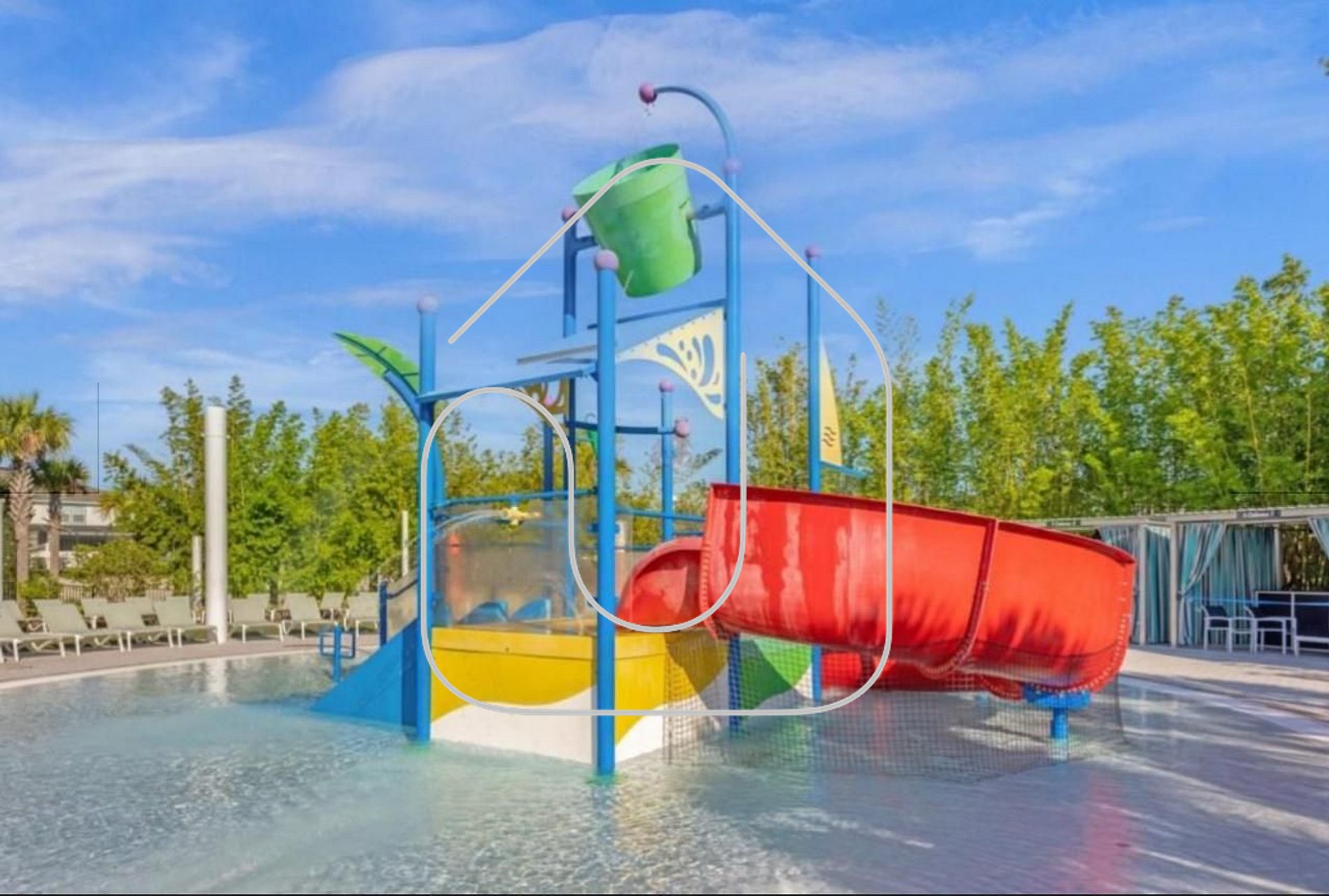 • Heated resort pool, lazy river, splash pad, and water slides
