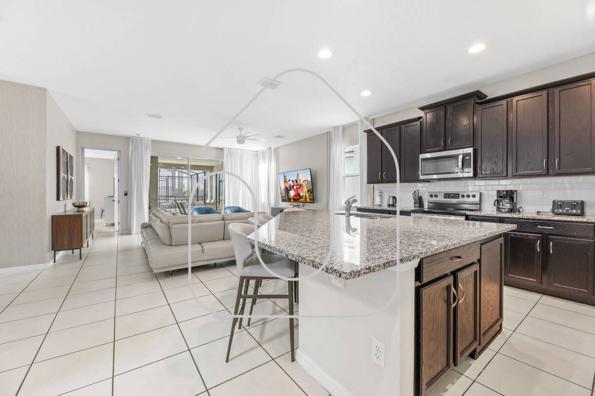The first floor features a beautifully designed open-concept living area with a fully equipped modern kitchen, a large dining table, and a cozy living room with a Smart TV — perfect for relaxing after a day at the parks. Sliding glass doors lead to the private screened pool area, ideal for sunbathing or enjoying a refreshing swim.