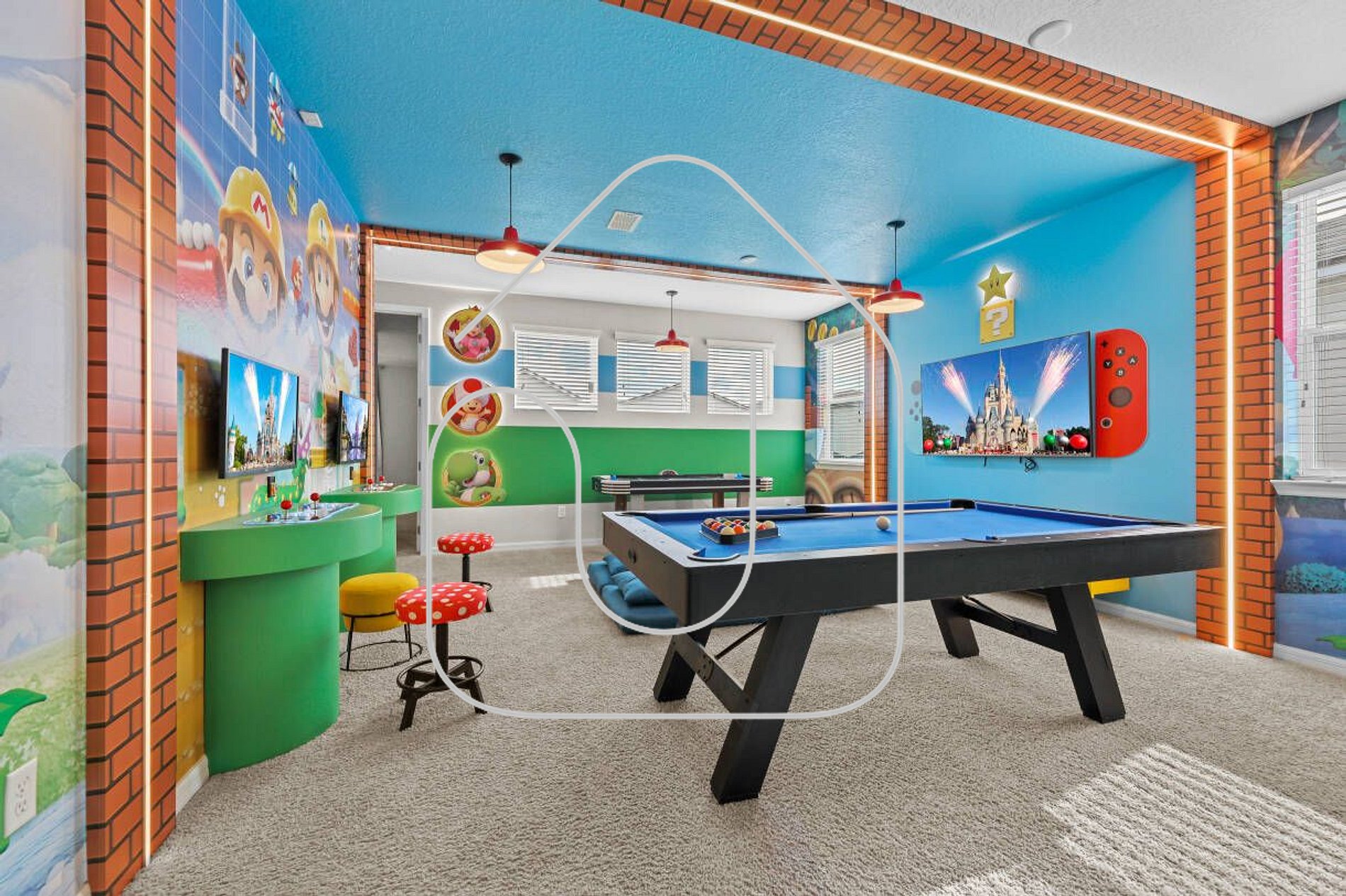 Upstairs, the fun continues. A spacious game loft with comfortable seating offers entertainment for guests of all ages.