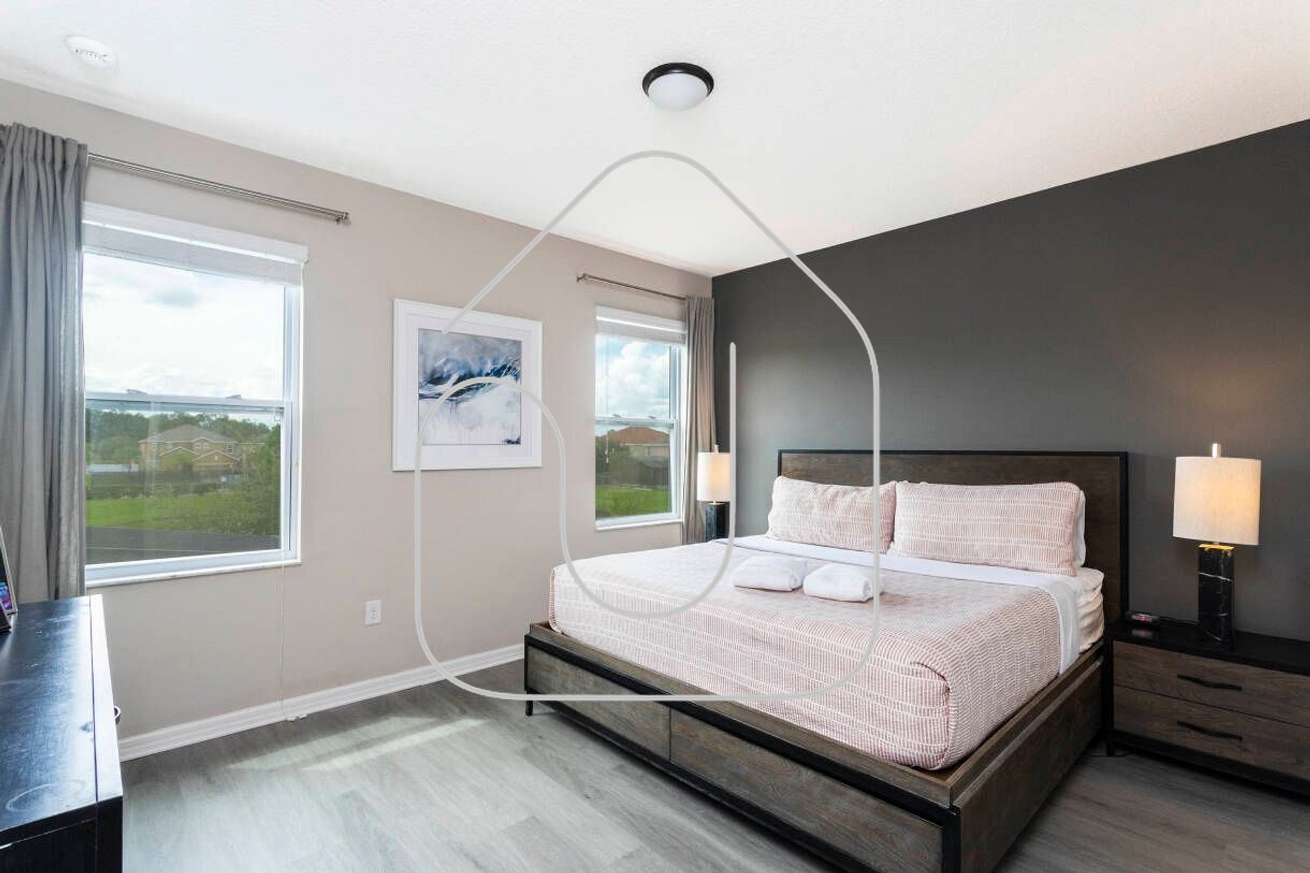 Recently renovated 9BR/7BA home with private pool in the gated Veranda Palms Resort. No carpet, fully equipped kitchen, open-concept layout, and modern décor. Perfect for large families and groups, just 15 minutes from Disney and close to Orlando’s top attractions. The resort features pools, waterslides, gym, and more. Pet-friendly, BBQ and pool heating available. Enjoy comfort, space, and fun for all ages in this amazing vacation retreat!