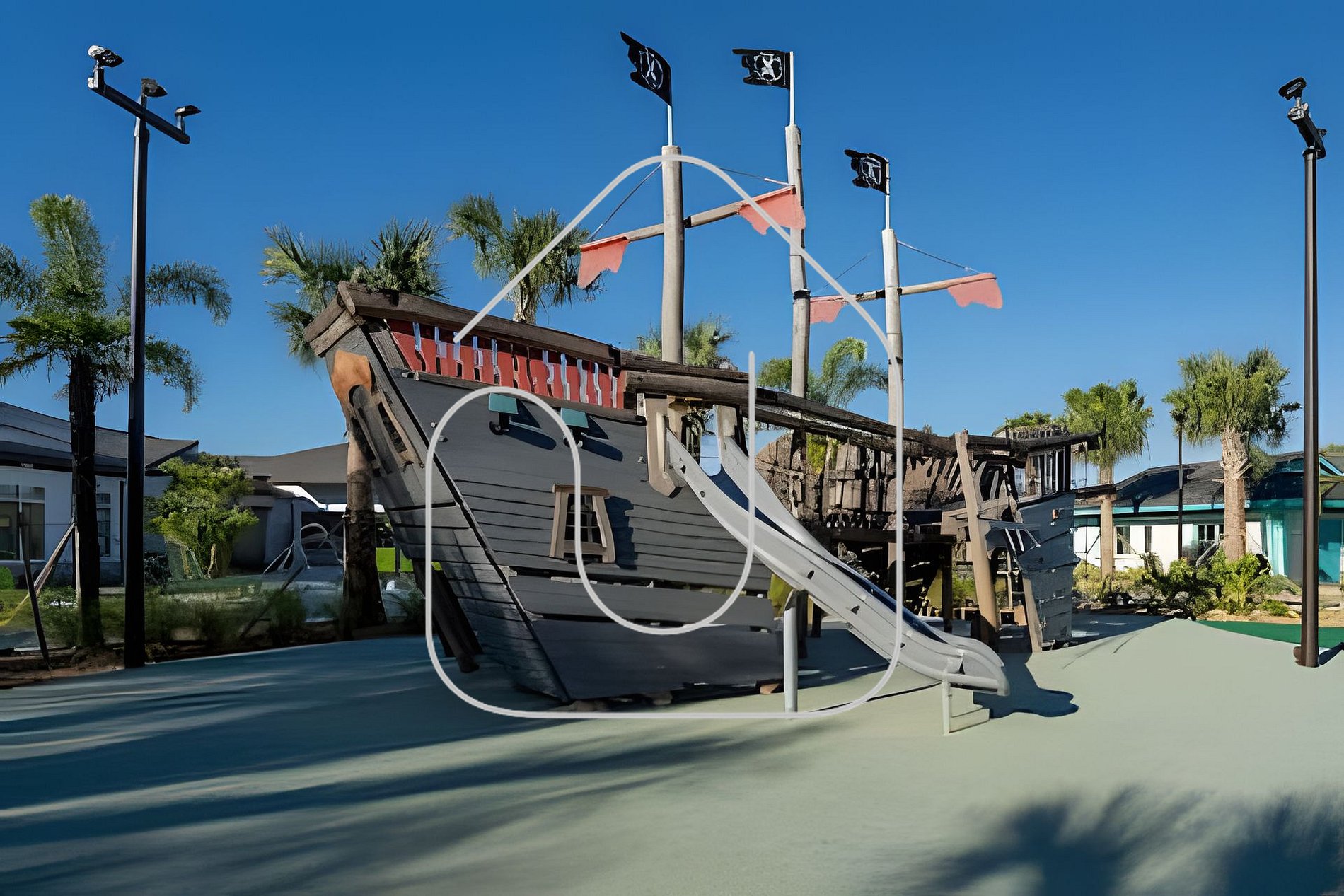 Pirate-themed playgrounds, lakes, and walking trails
