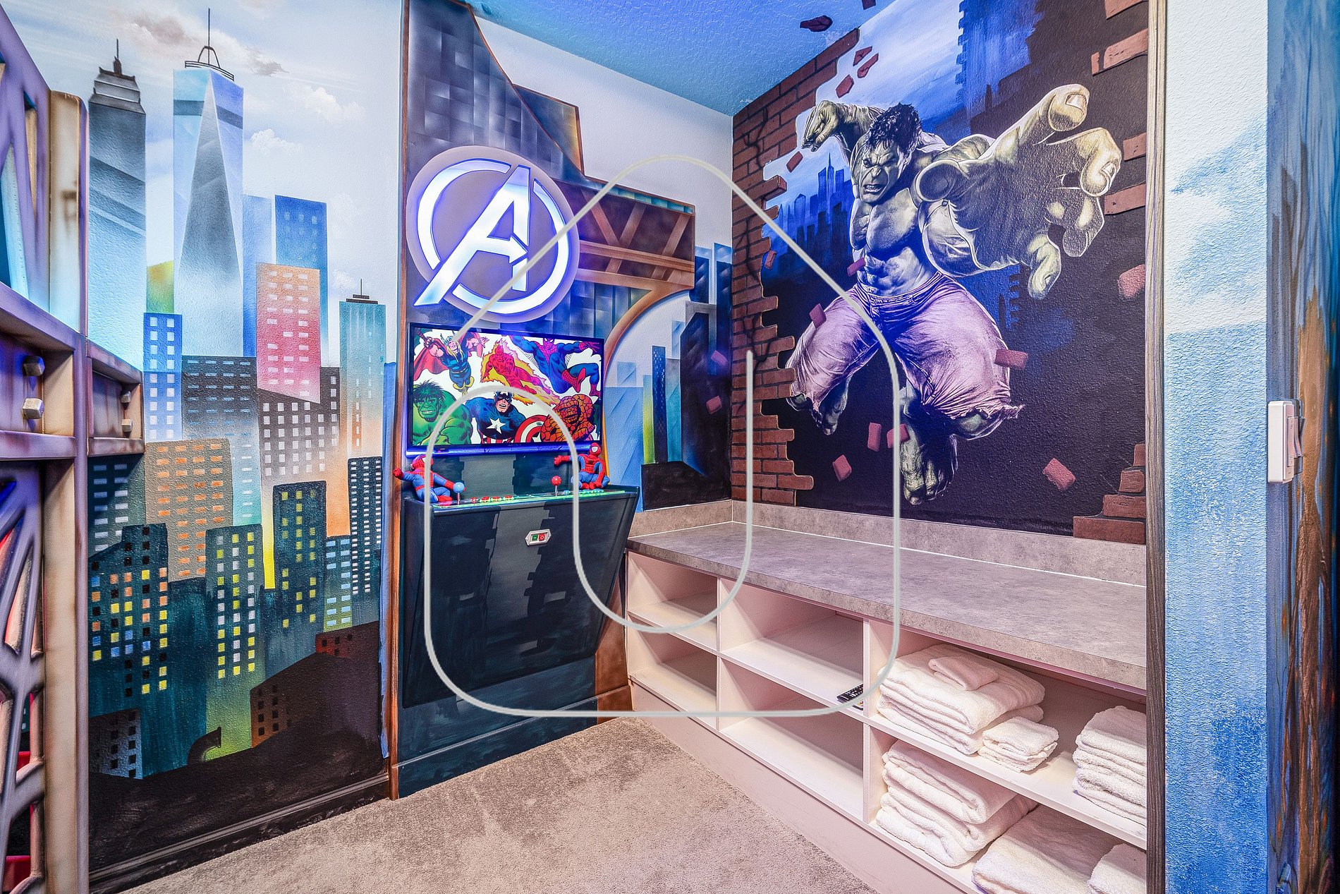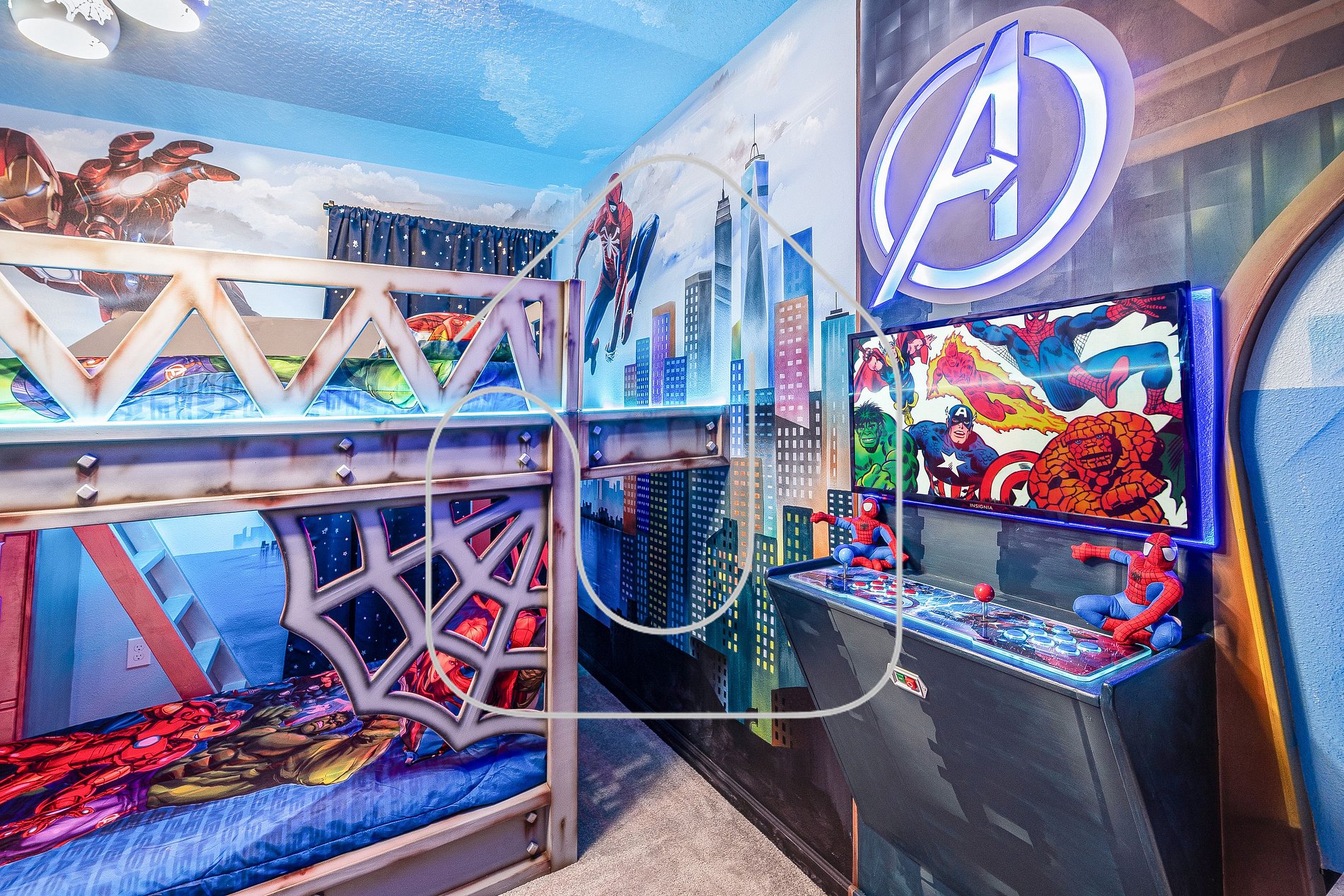 • Avengers bedroom with two twin-over-twin bunks, private bathroom