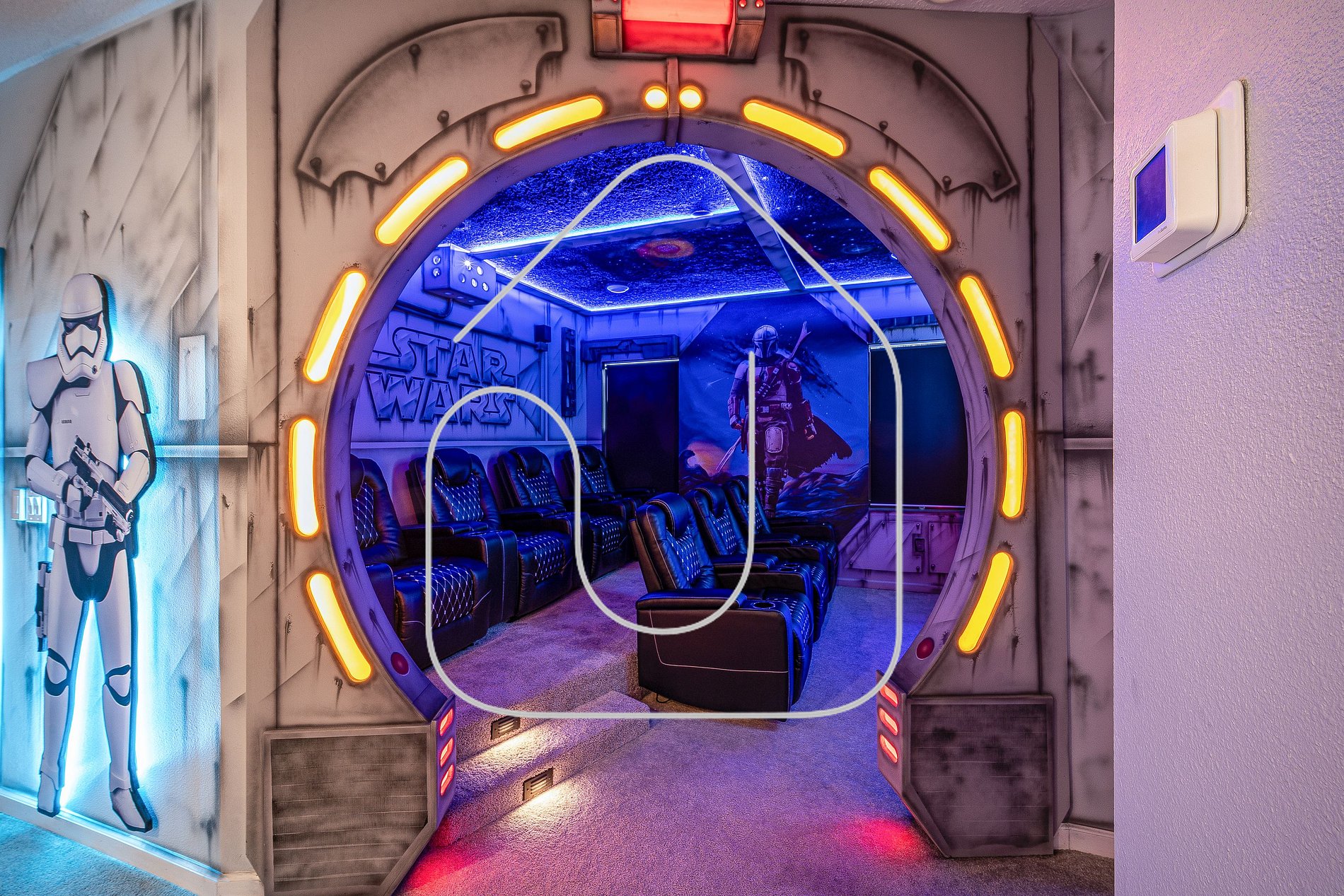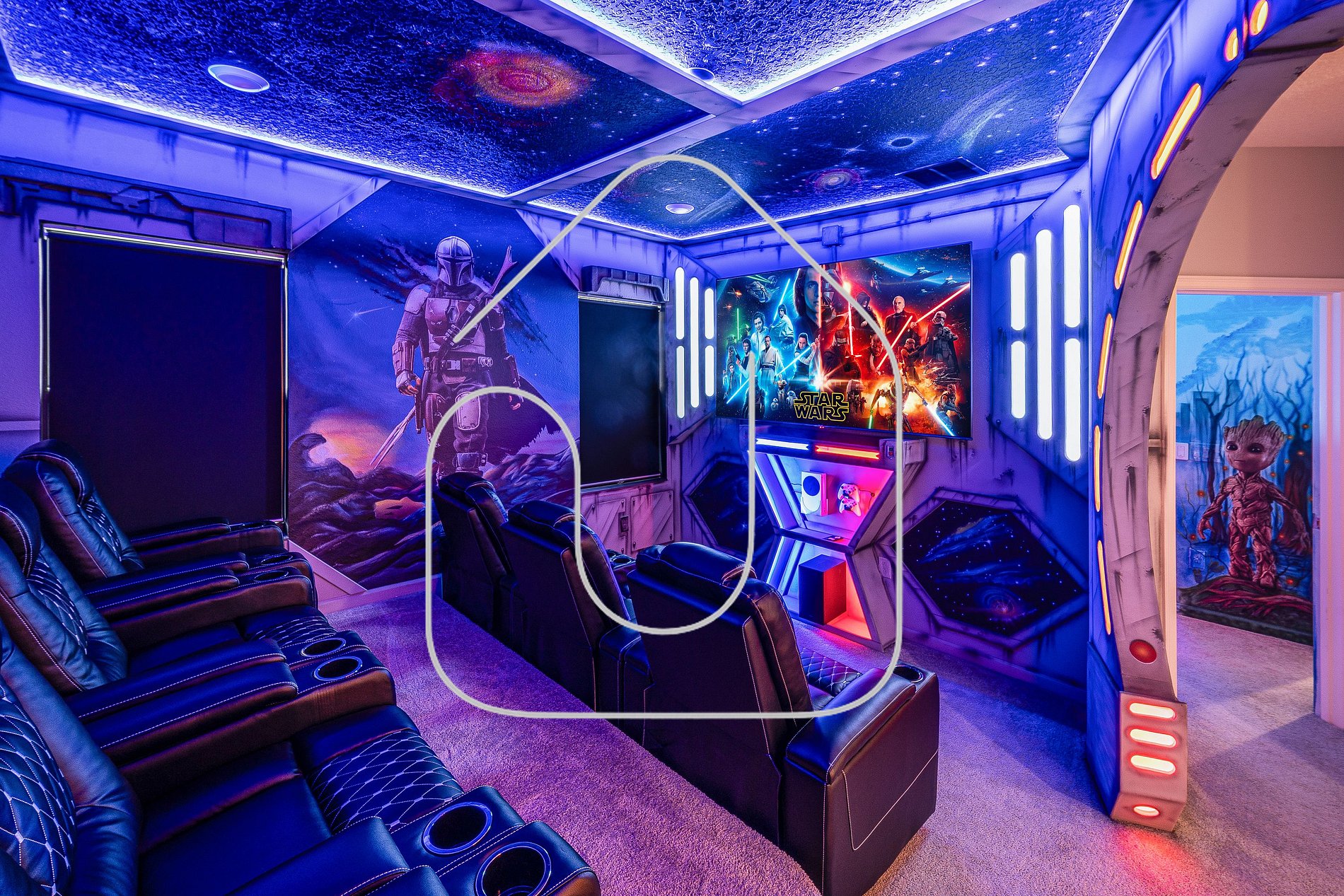 Located in Paradiso Grande, Orlando’s newest luxury community, this 8-bedroom villa brings a sense of exclusivity and sophistication. With private pool and spa, Star Wars cinema, and a Mario Bros game room, the home blends upscale living with immersive entertainment. Disney is only 15–20 minutes away and Universal about 12 minutes, giving you the most convenient access to Orlando’s top attractions.