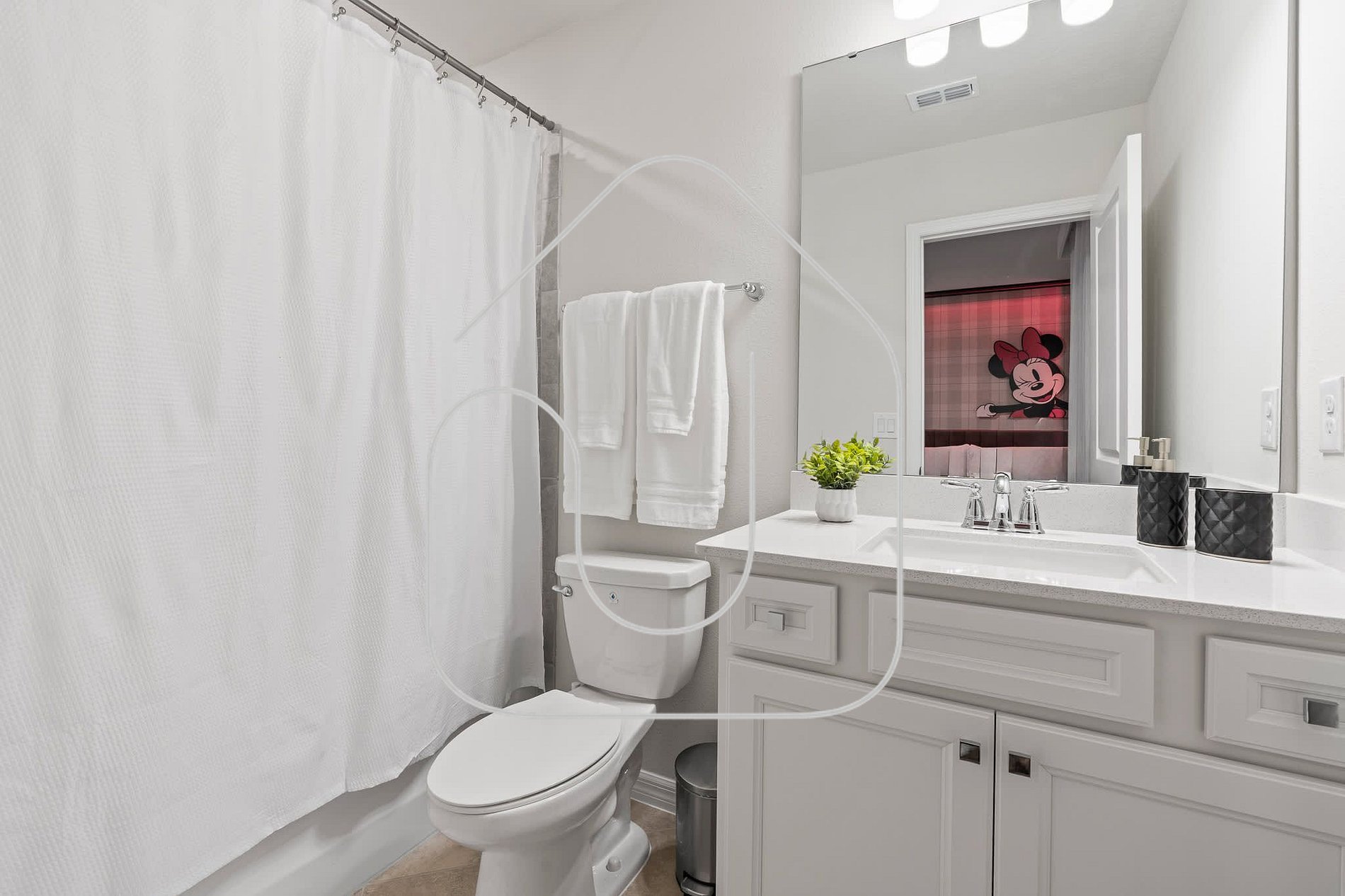 Mickey themed bedroom with double and single beds and ensuite bathroom