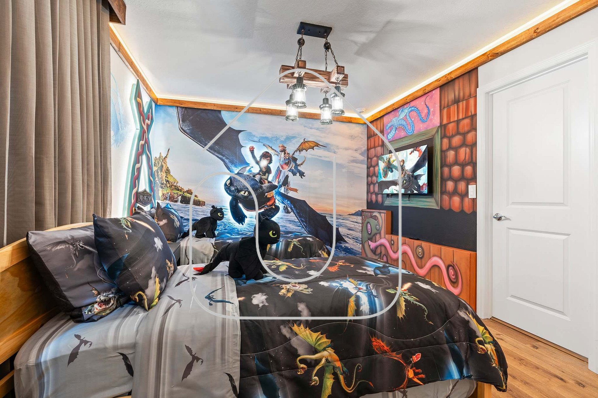 Dragons themed bedroom with two single beds plus trundle and ensuite bathroom