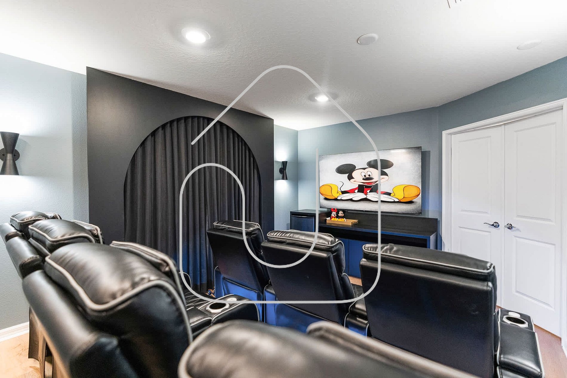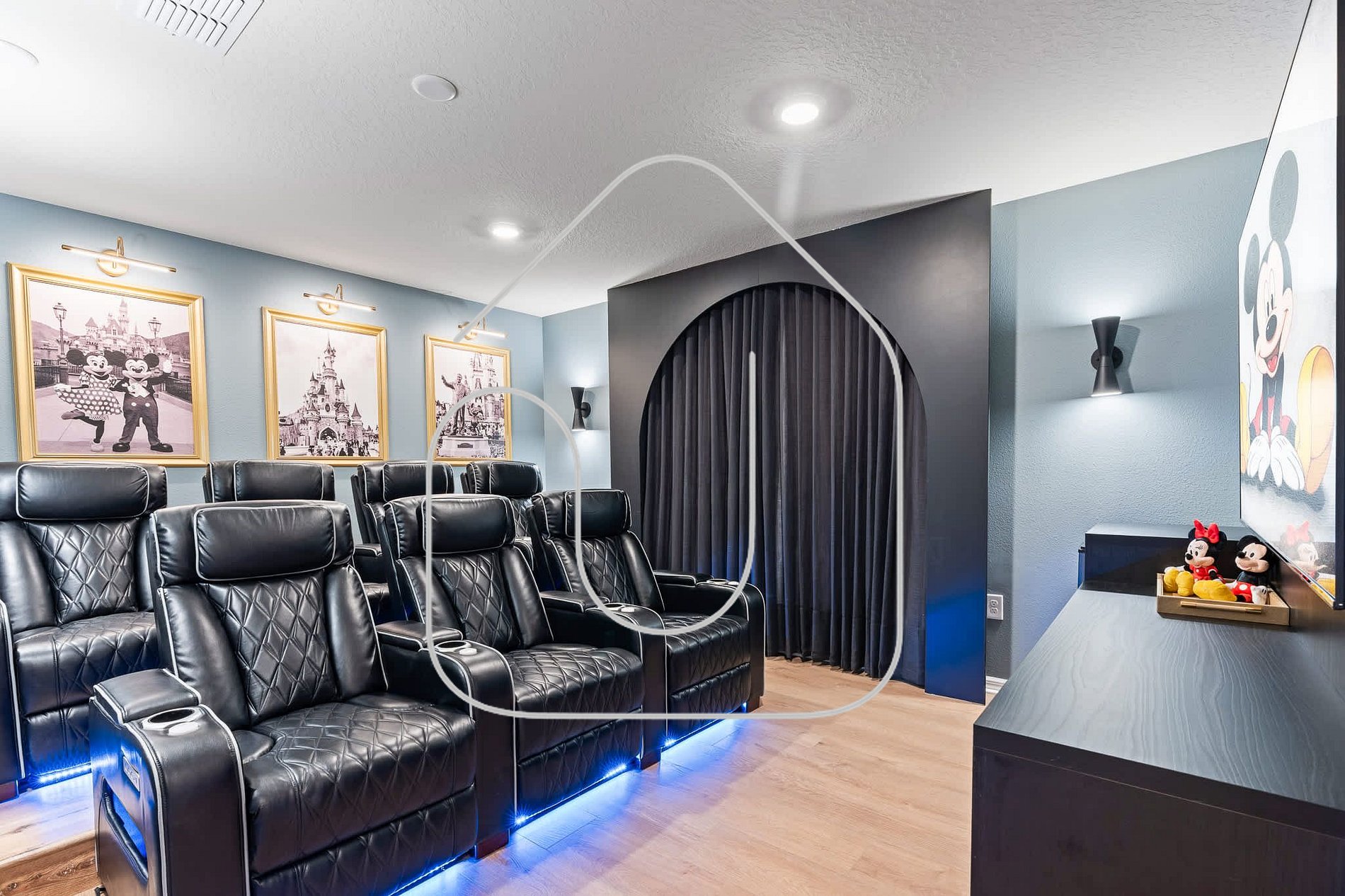 Located just minutes from Walt Disney World, this luxury 5-bedroom, 5-bath villa at Windsor Cay Resort combines modern décor, immersive themed rooms and premium entertainment spaces. Families enjoy the private heated pool, the Star Wars themed game room and a dedicated home theater with reclining chairs. The atmosphere is ideal for relaxing, gathering and enjoying a true resort-style vacation.