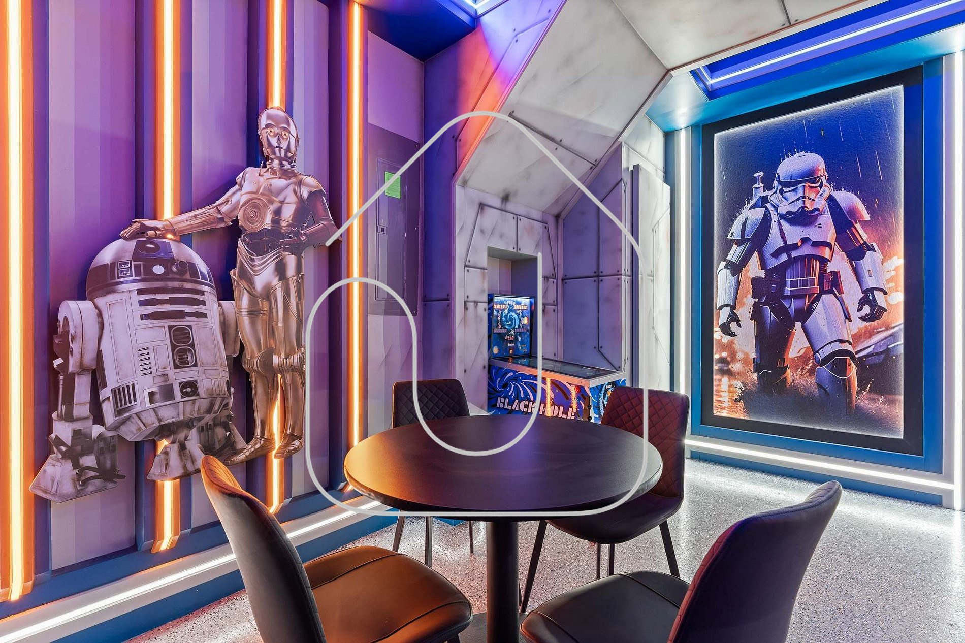 Star Wars game room with pool table, foosball and arcade games