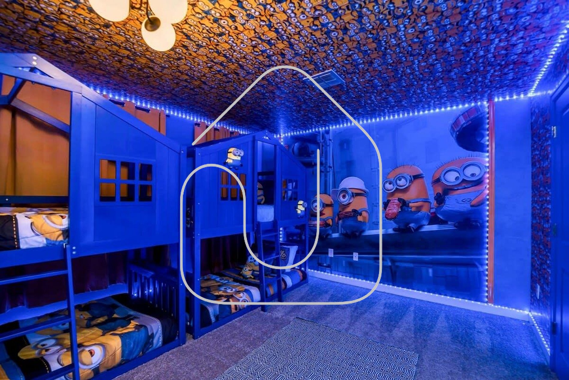 • Bedroom 7: Minions-themed room with two bunk beds (singles) and slide, ensuite