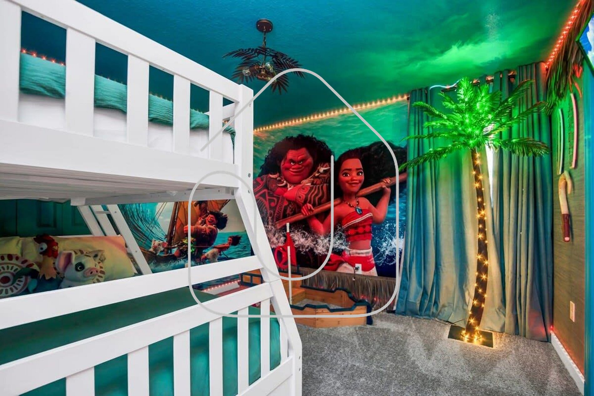 • Bedroom 8: Moana-themed room with bunk bed (double + single), ensuite