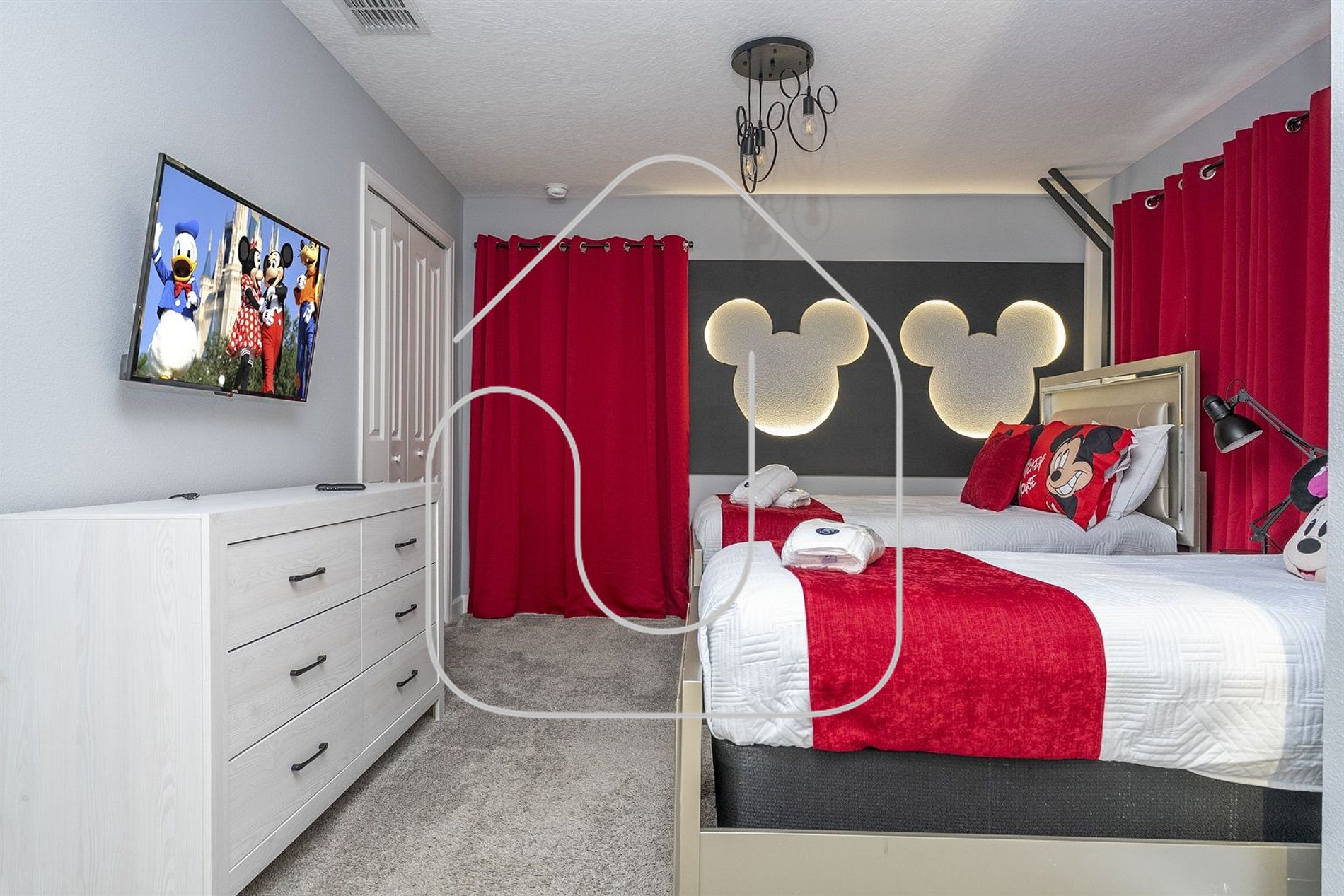 Guests have full access to the entire home, private screened pool, driveway and all Storey Lake Resort amenities including lazy river, dual water slides, splash park, heated pool, tiki bar, gym and mini‑golf.
