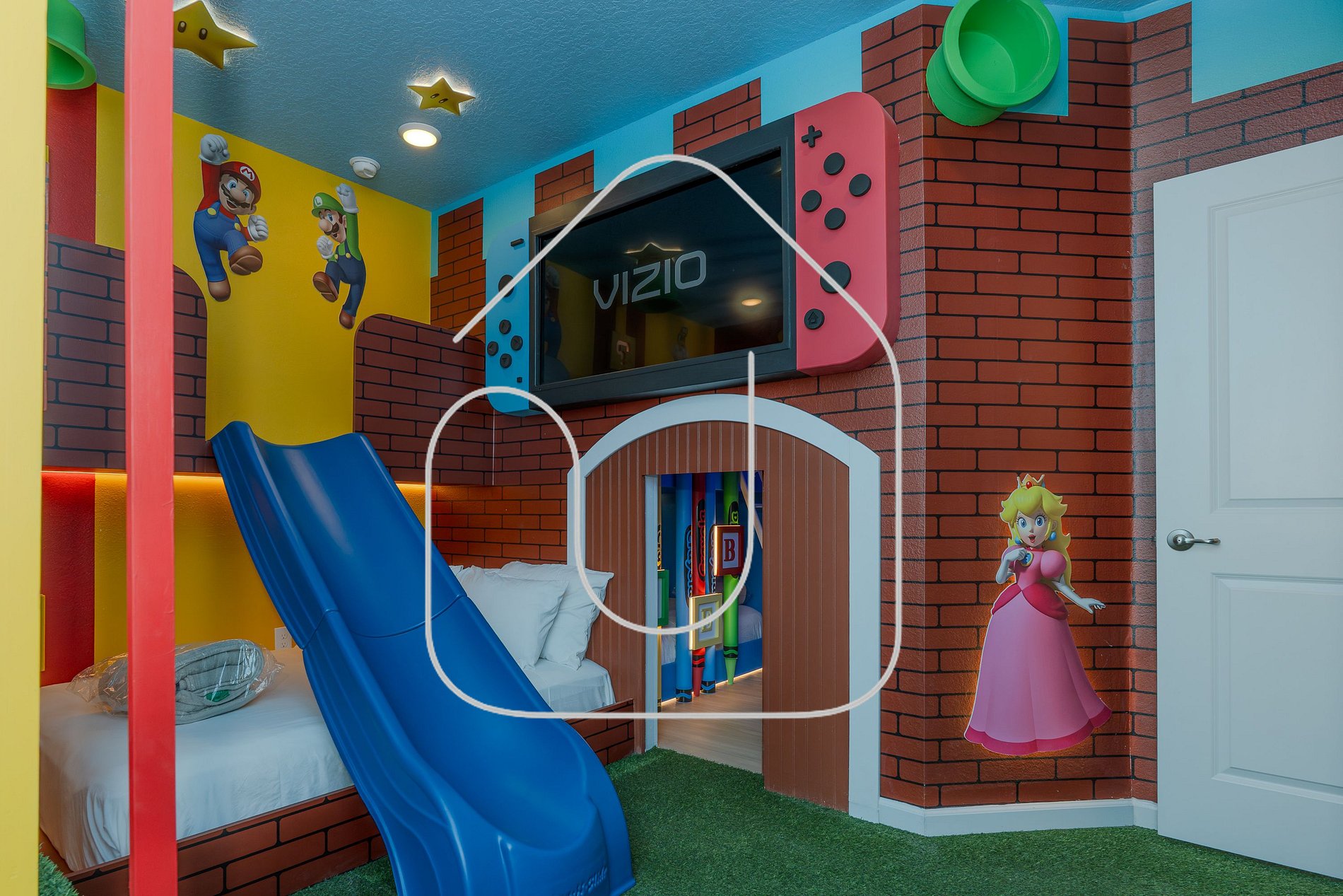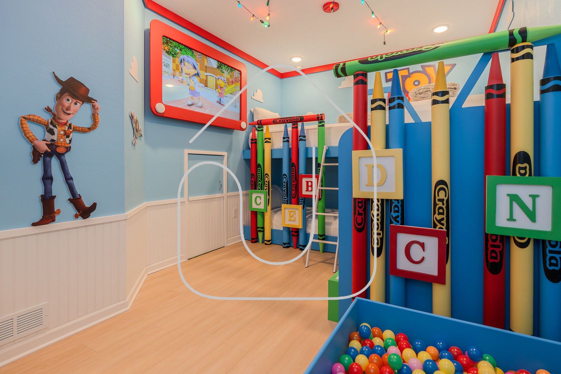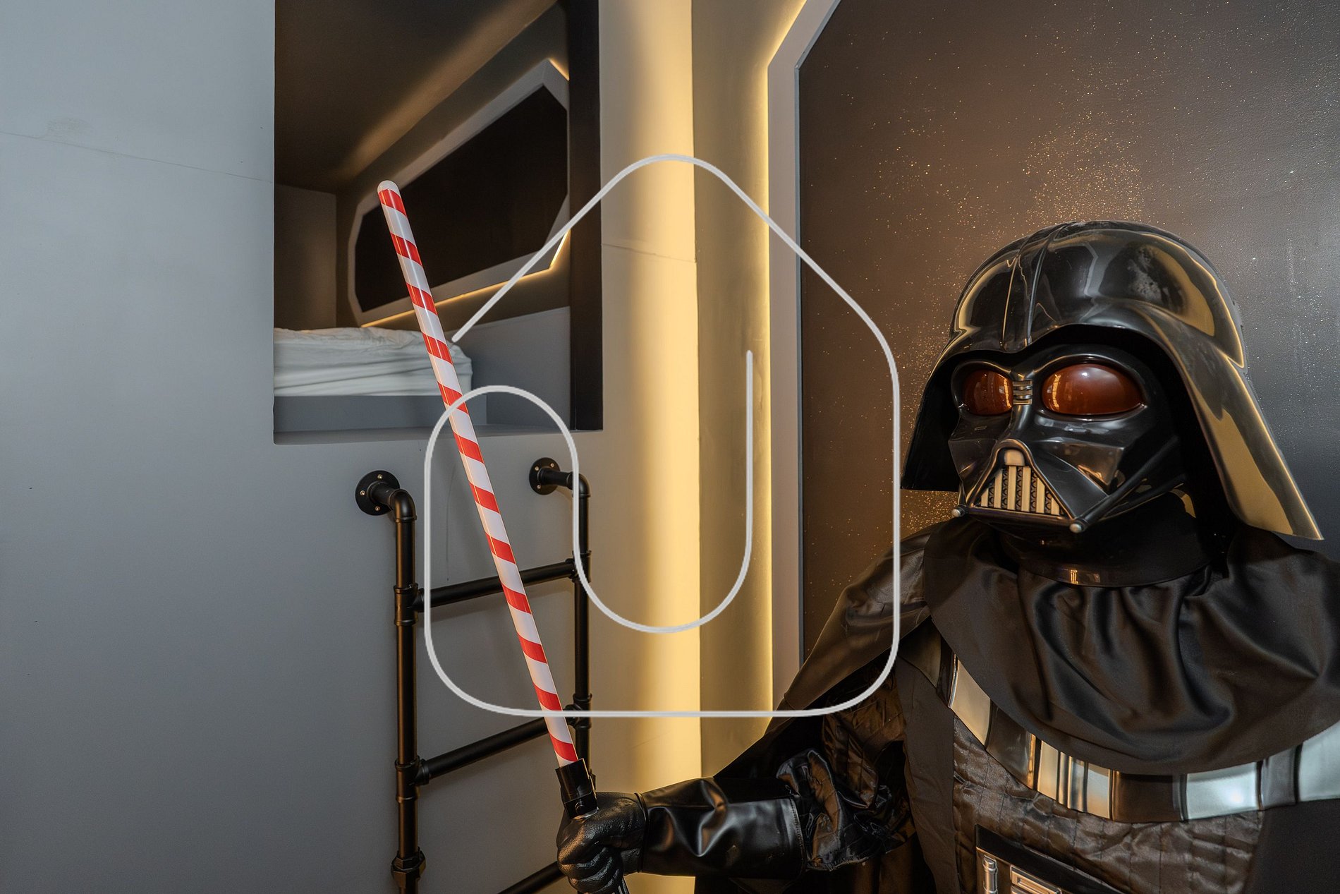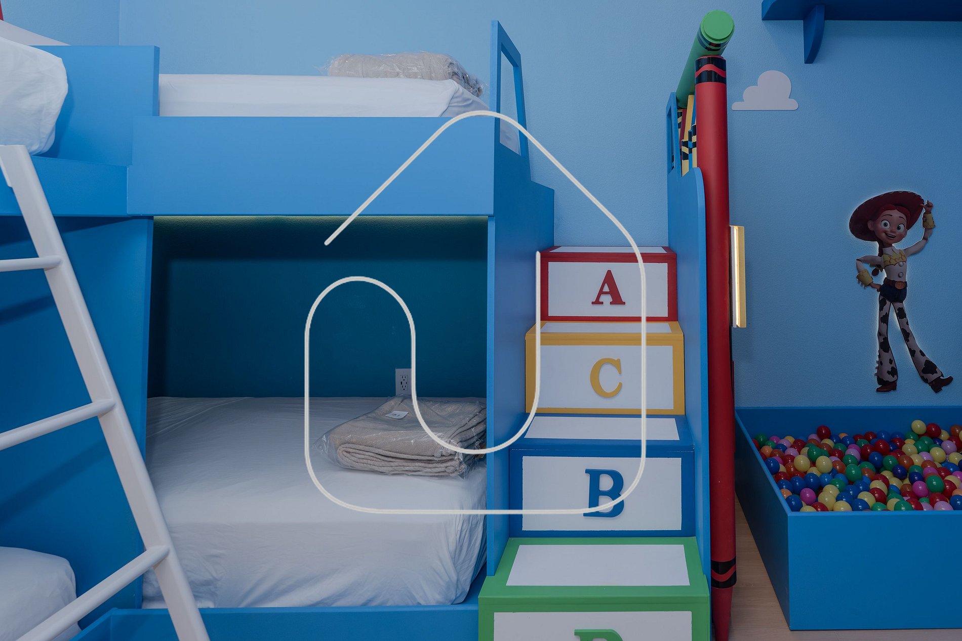 The themed bedrooms elevate the stay even further. One room transports guests into a colorful adventure world with custom bunk beds and playful design elements. Another brings cinematic sci-fi vibes with bold décor and dramatic lighting. These are not simple themed rooms — they are immersive spaces that make kids and adults smile the second they walk in.