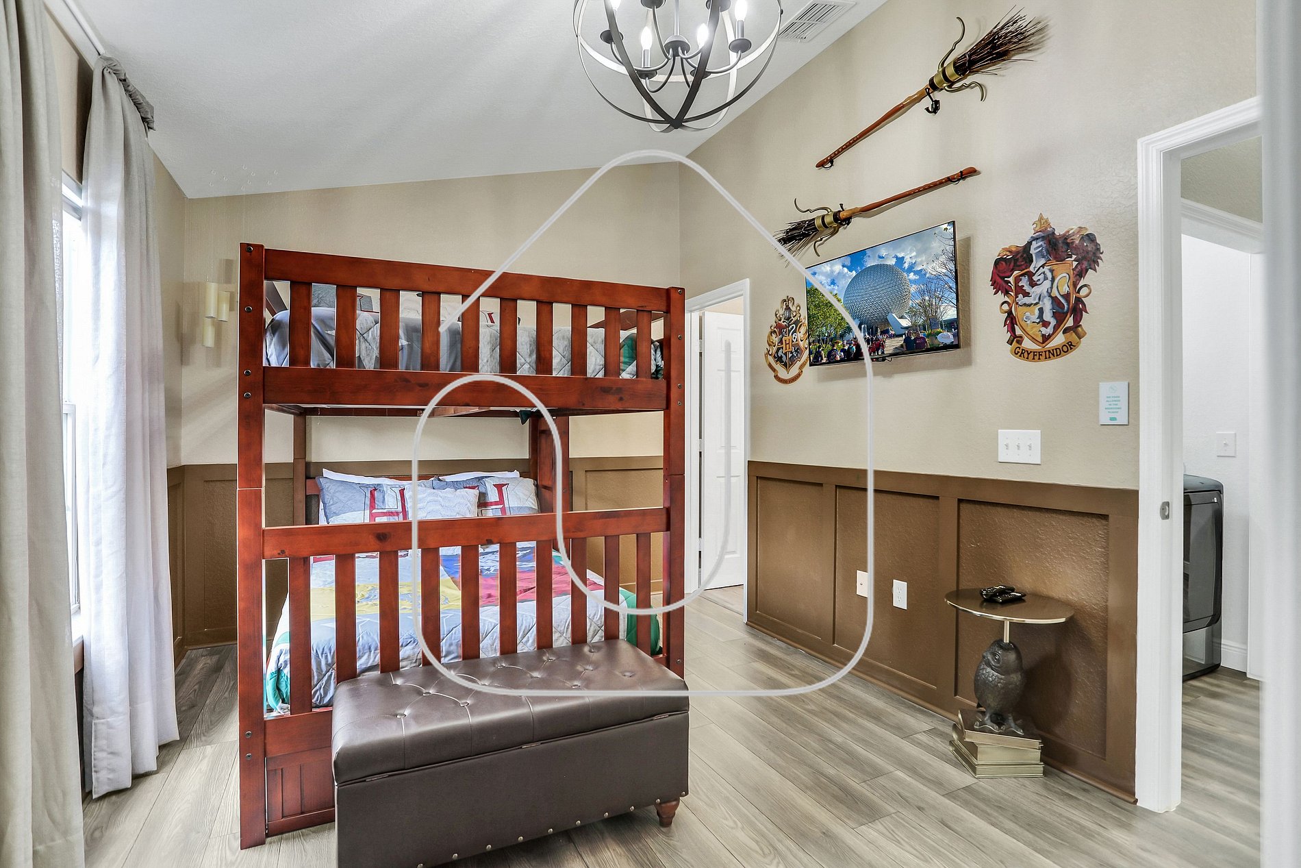 • Themed Room: Harry Potter-style decor with full/full bunk bed + twin bed, private bathroom.