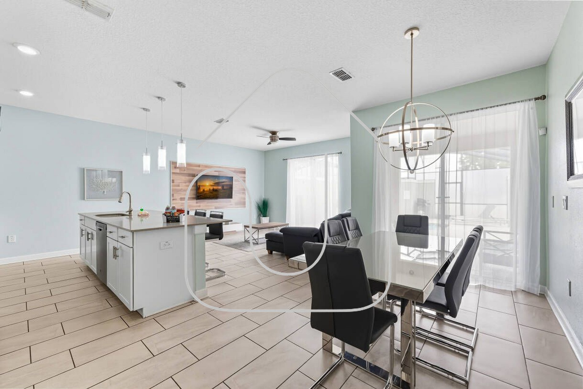 Spacious open-concept living room with 5-seat sofa, armchair, and Smart TV