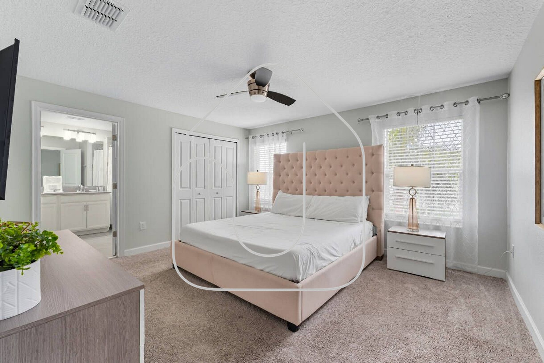 Master Suite (Upstairs): 1 King bed, Smart TV, walk-in closet, private bathroom with shower