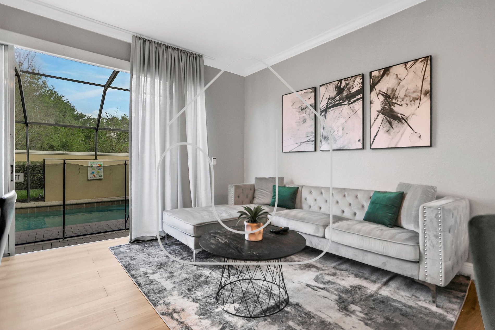 tay at our charming 3-bedroom, 3-bathroom townhome, featuring modern furniture and a private pool, perfect for relaxing after a day at the parks. Our home is carefully maintained to welcome you and your family with maximum comfort and convenience. Enjoy the Florida sunshine while relaxing in a delightful outdoor space, complete with comfortable furniture.