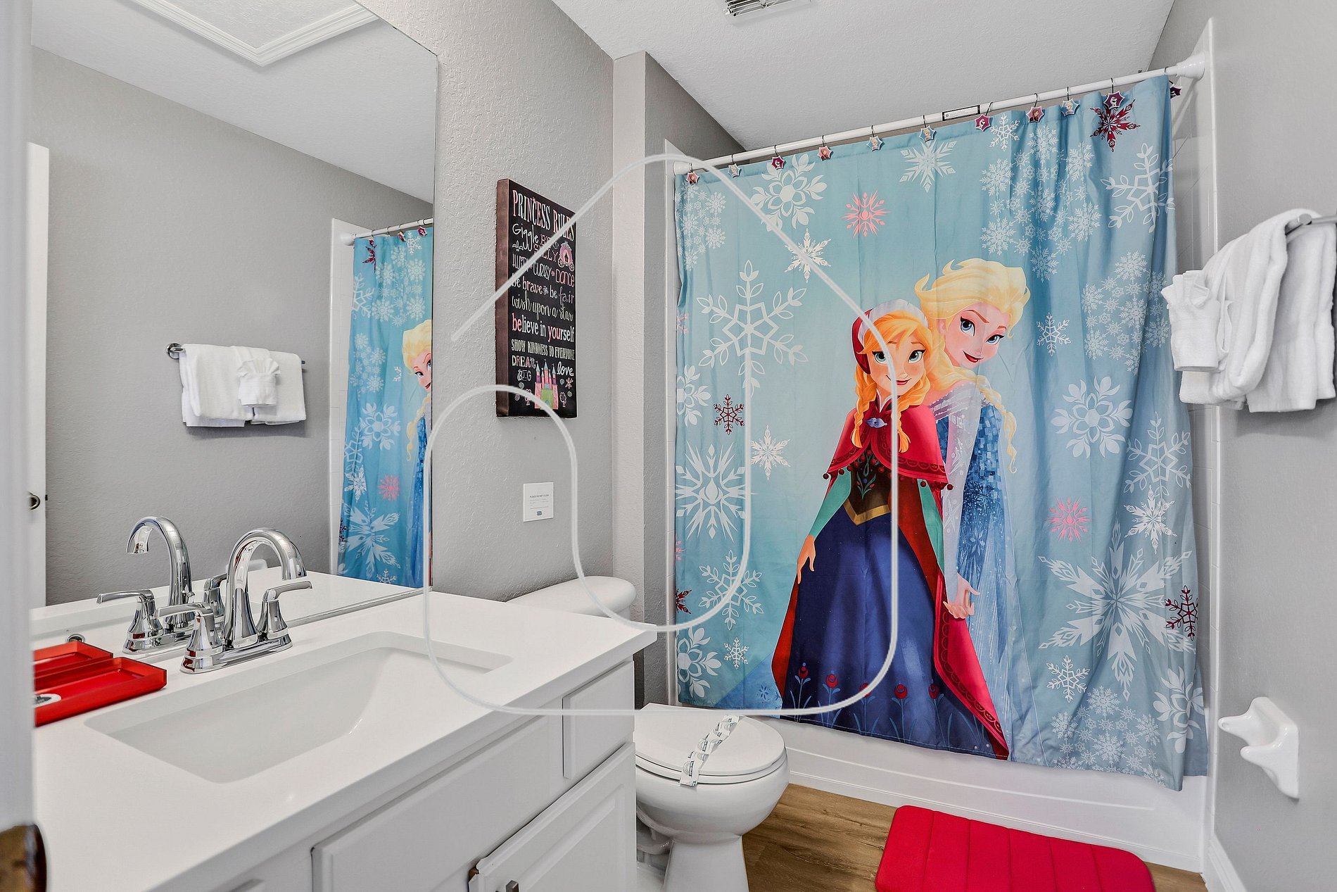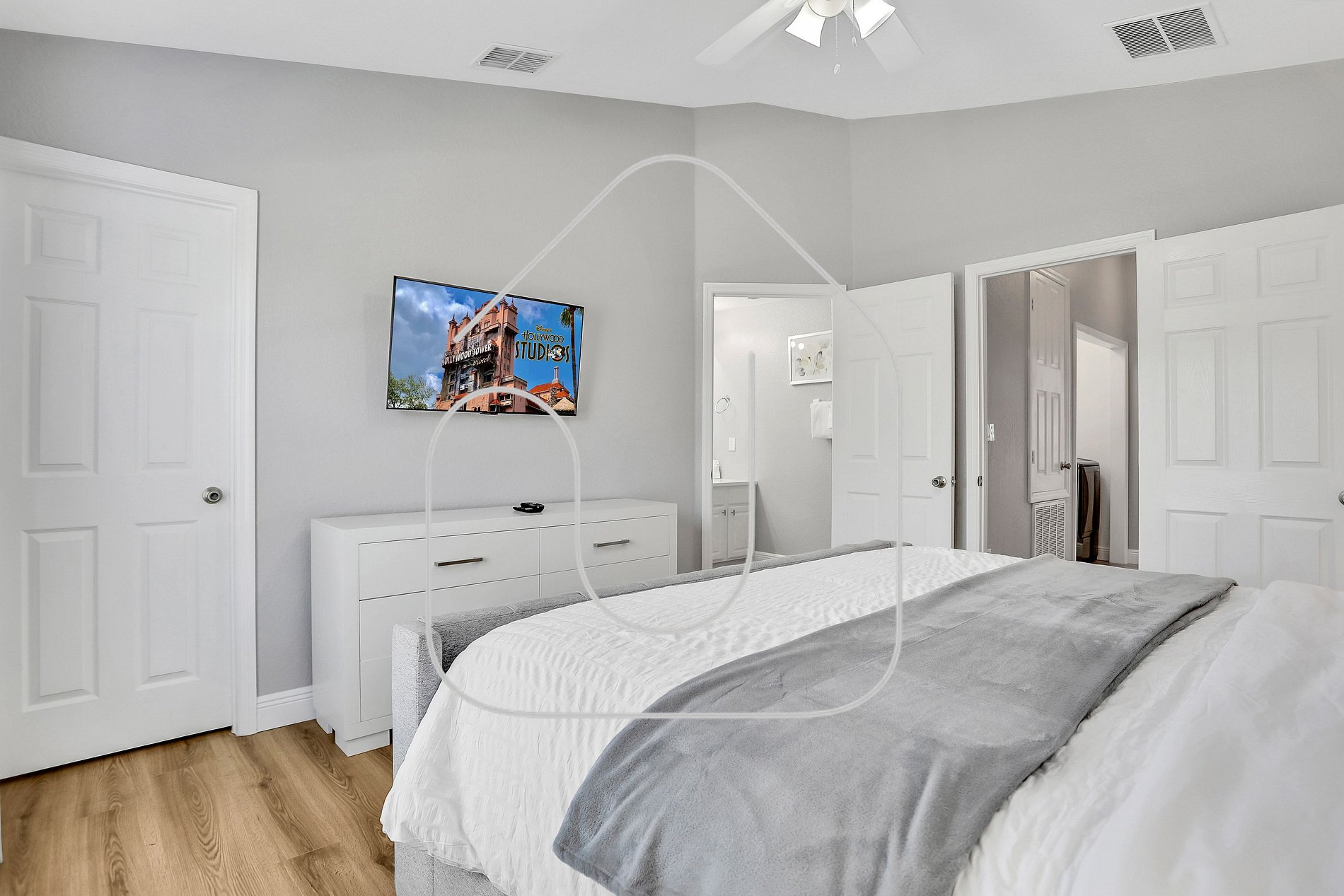 Master Suite with a king-size bed, walk-in closet, SMART TV, and private bathroom Princess-Themed Room with Full/Full bunk beds and SMART TV