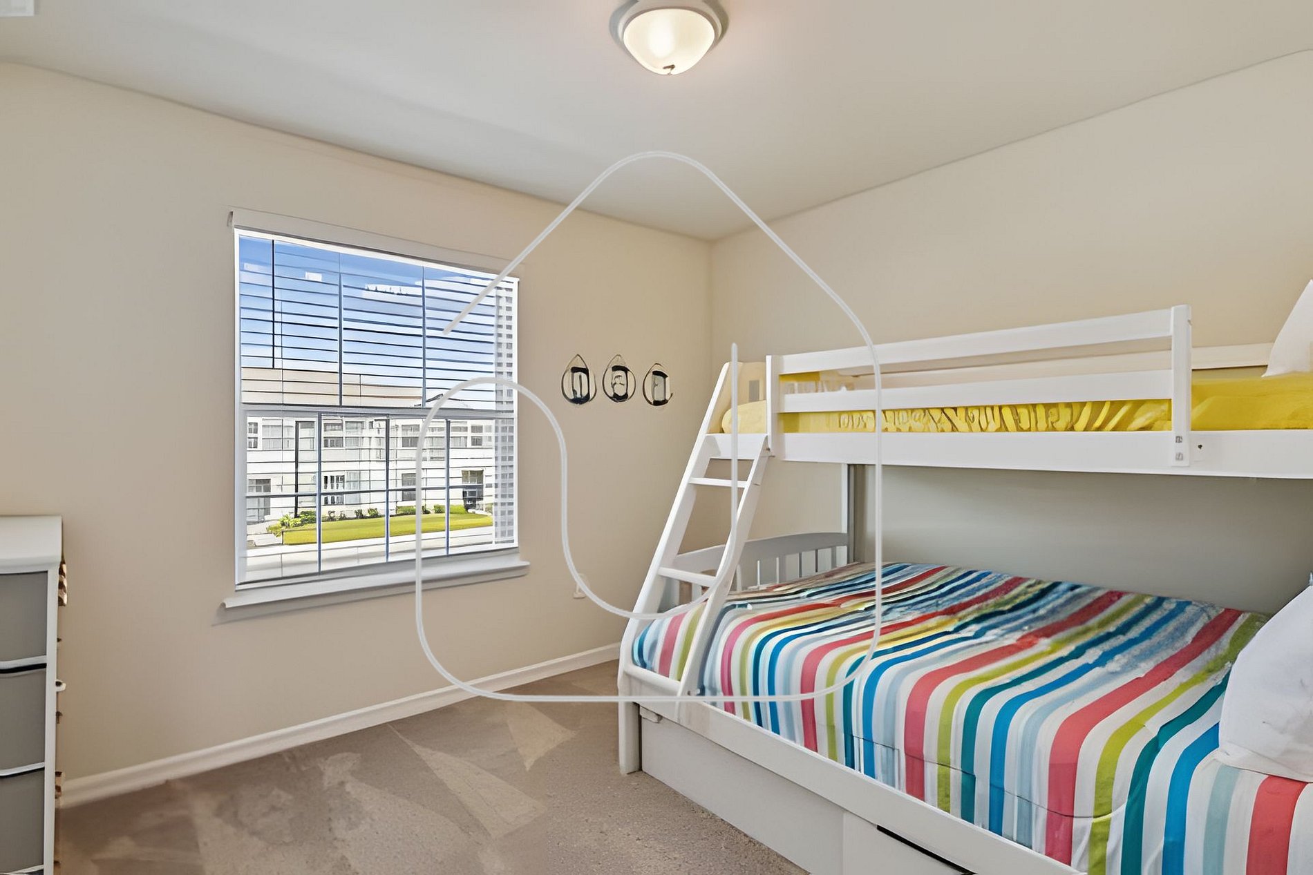 Bedroom 3: Bunk bed (Twin over Full) + Smart TV + shared bathroom