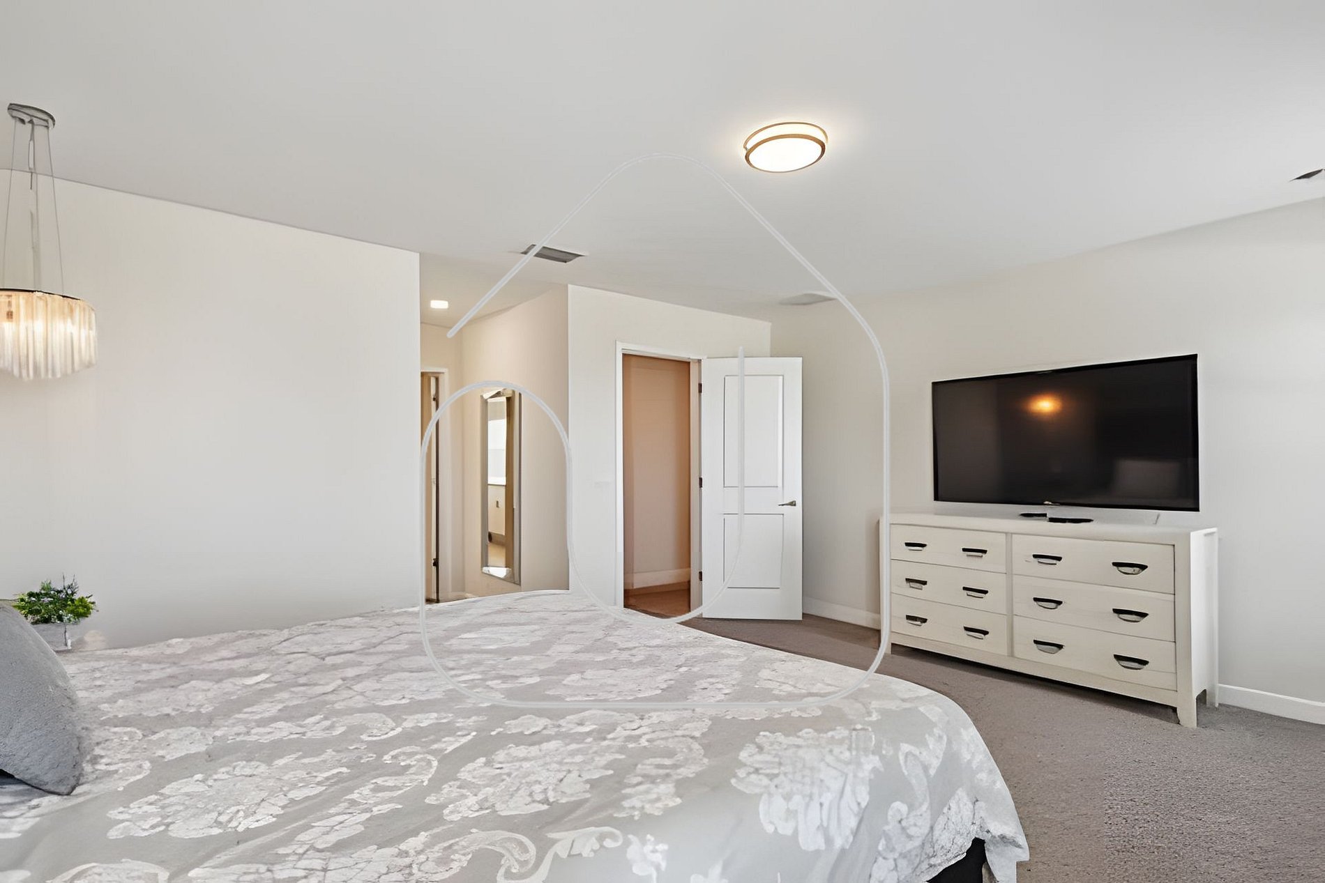 - Master Suite 1: King bed, Smart TV, closet, private bathroom