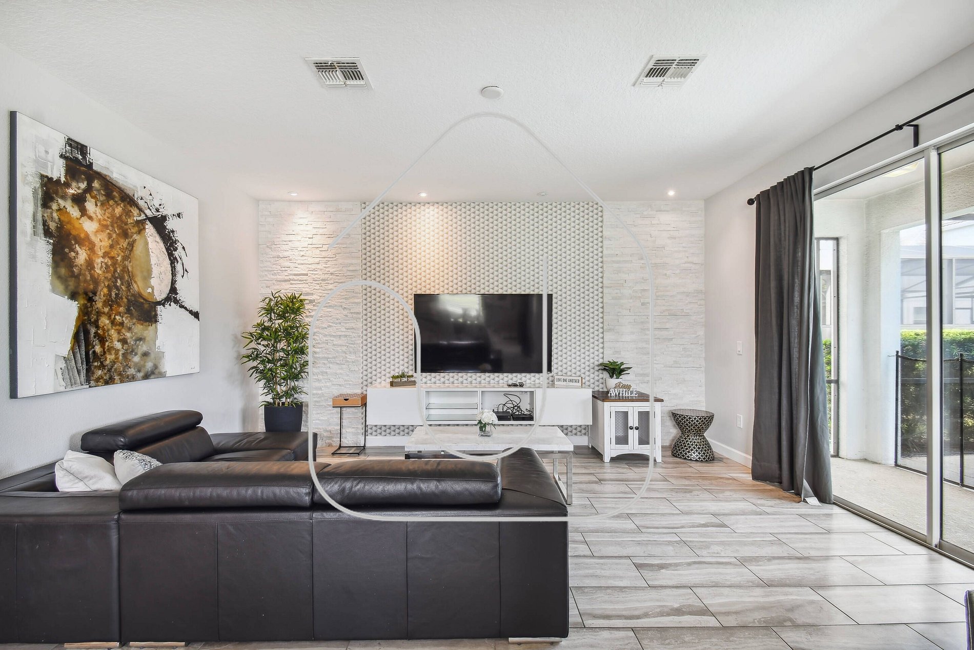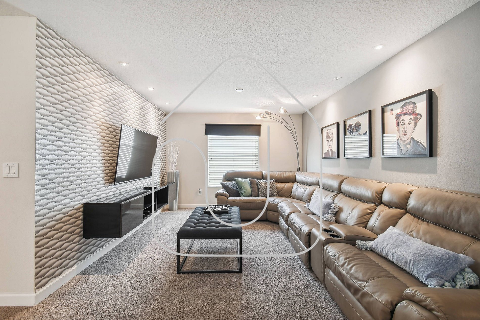 Spacious living room with 8-seater sofa, loveseat & 65” Smart TV, direct access to screened lanai & private pool
