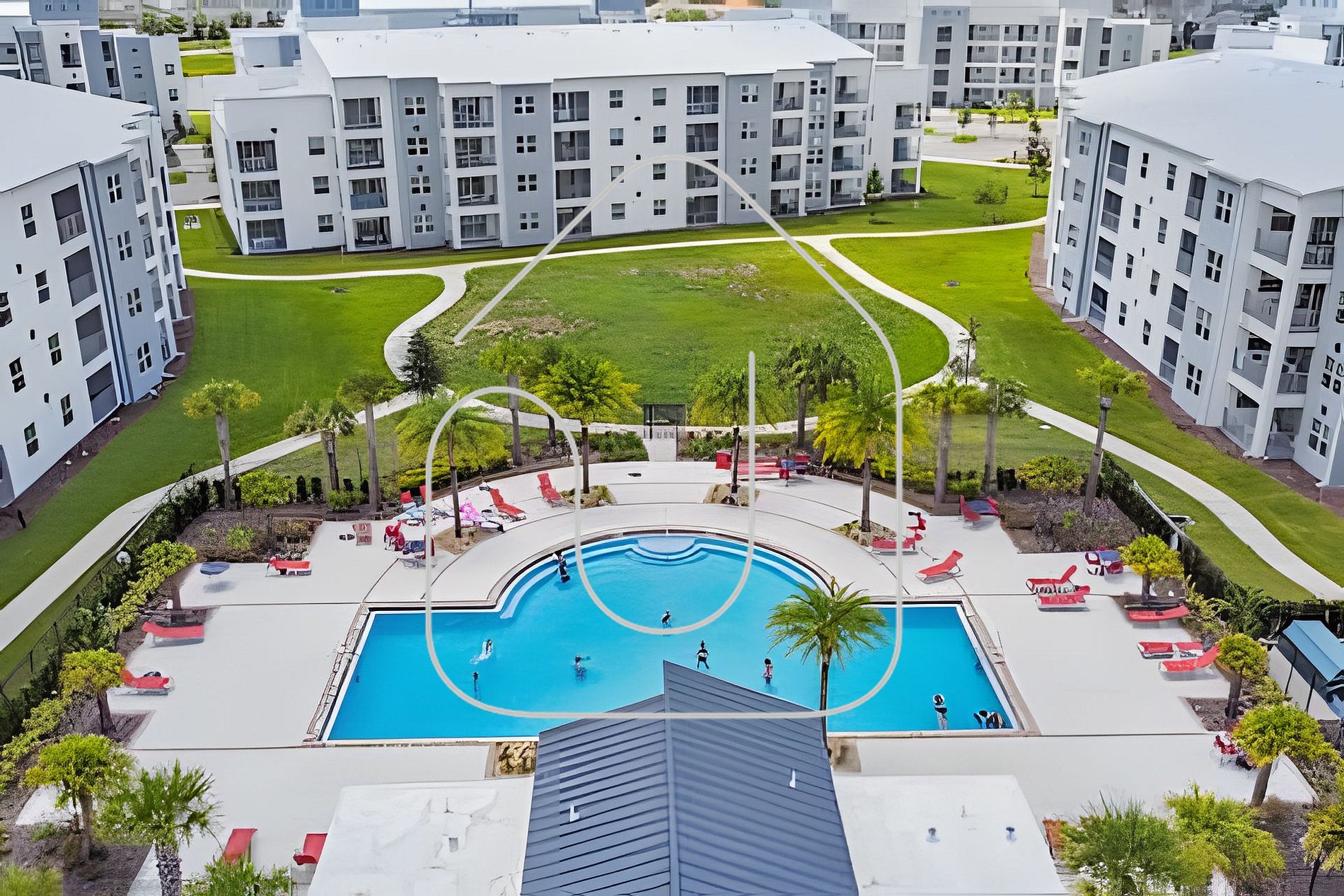 Resort Amenities Clubhouse with fitness center, business center, and spa Lazy river, splash park, playground, and mini golf Resort-style pools & hot tub Tiki bar with drinks & snacks Sports courts (volleyball, basketball, more)
