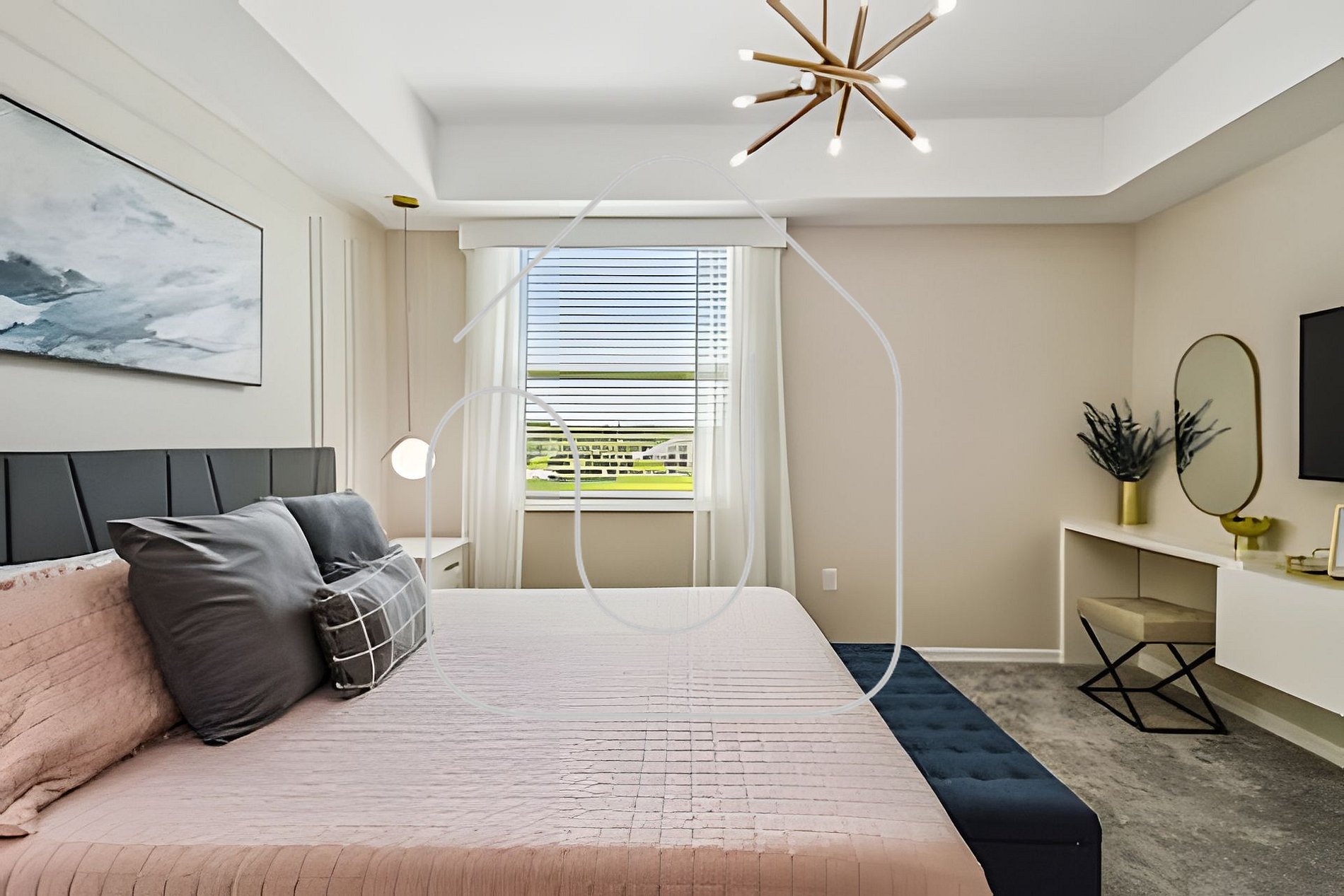 Inside the Condo Living Room: Spacious with a 65” Smart TV, 6-seat sofa, and access to a screened balcony. Dining & Kitchen: Dining table for 6 + breakfast bar for 2. Fully equipped kitchen with modern appliances. Bedrooms: Master Suite: King bed, Smart TV, private bathroom. Queen Bedroom: Queen bed, Smart TV, shared bathroom. Mickey-Themed Bedroom: Bunk bed (Full + Twin), Smart TV, shared bathroom.