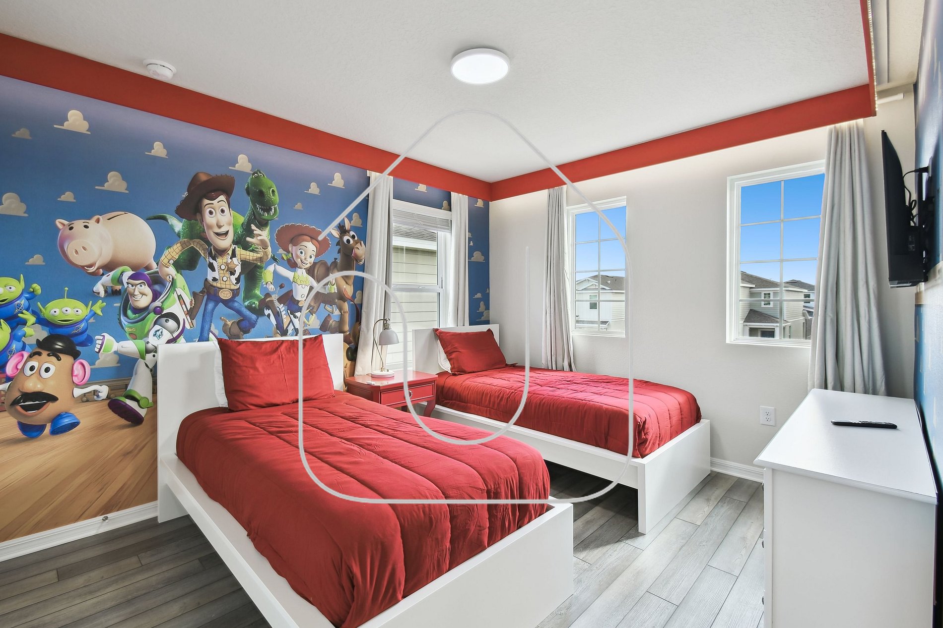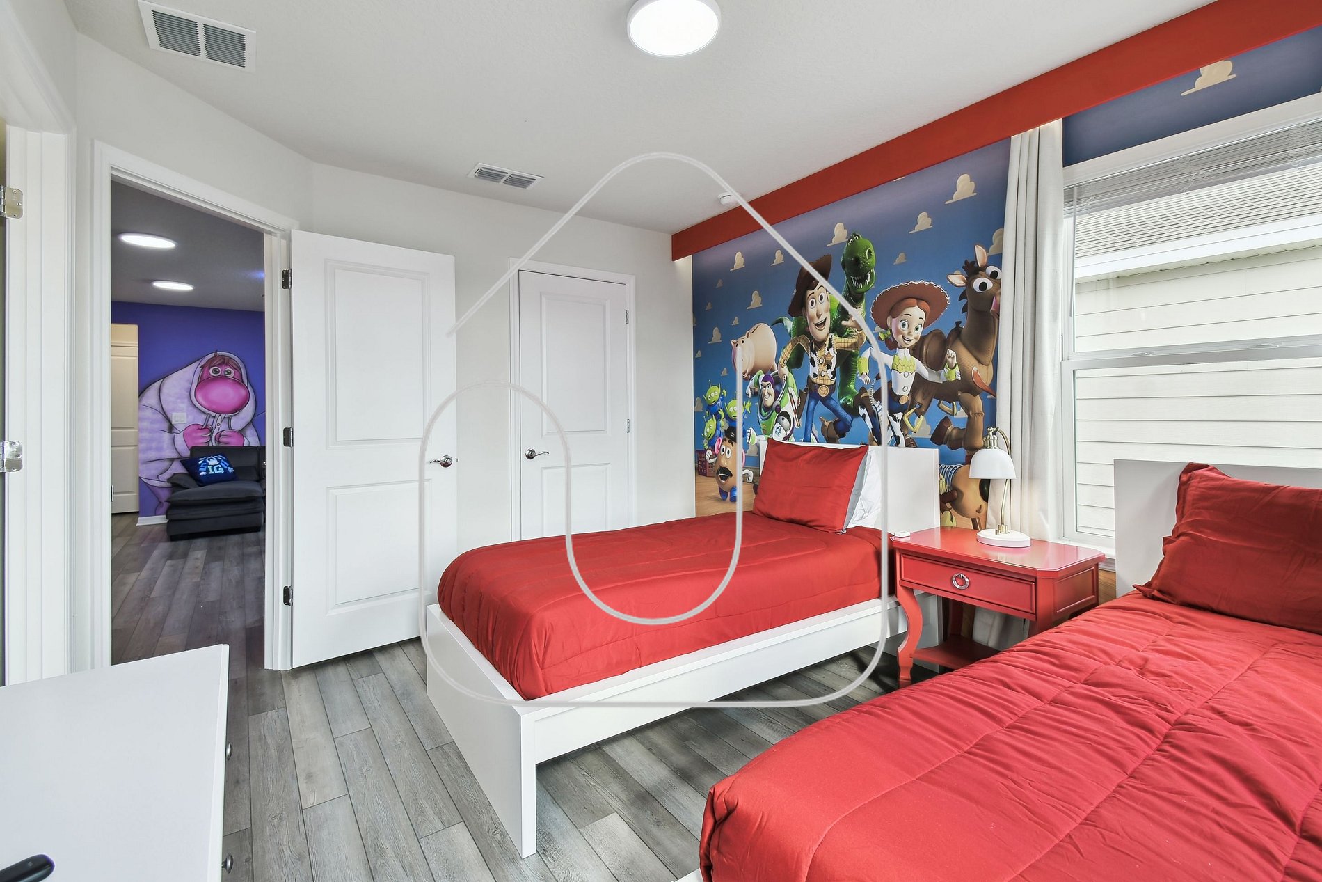 - Toy Story Suite: 2 Twin beds, SMART TV, closet, and shared bathroom.