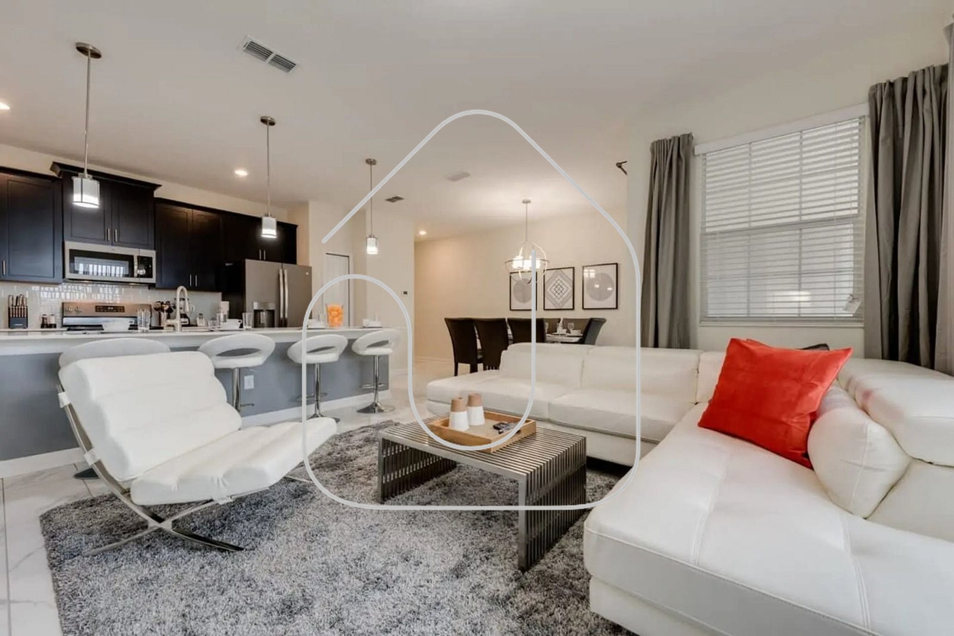 Spacious open-concept layout seamlessly connecting the living room, dining area, and fully equipped kitchen
