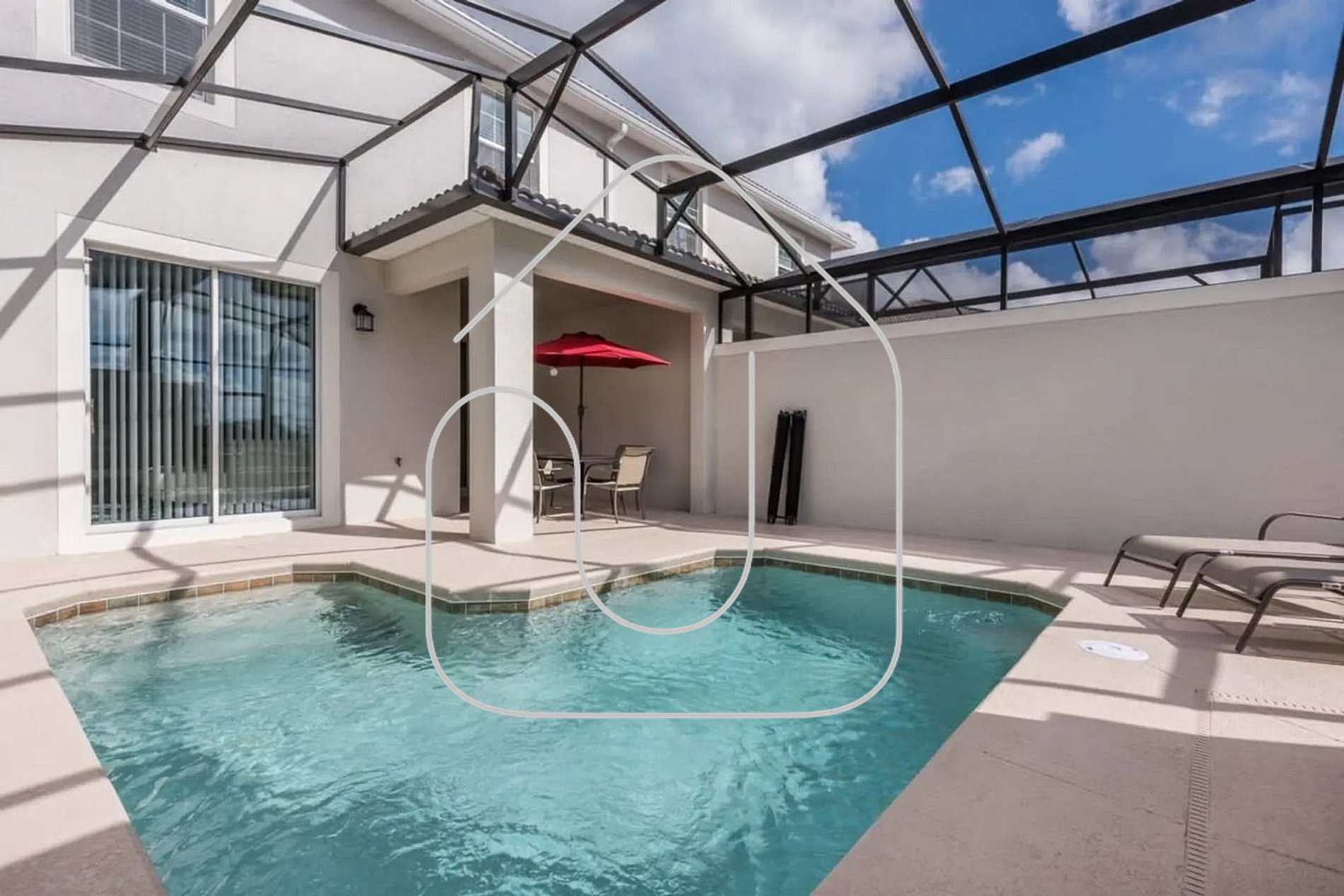Private screened-in patio with a heatable pool, perfect for relaxing after a day at the theme parks