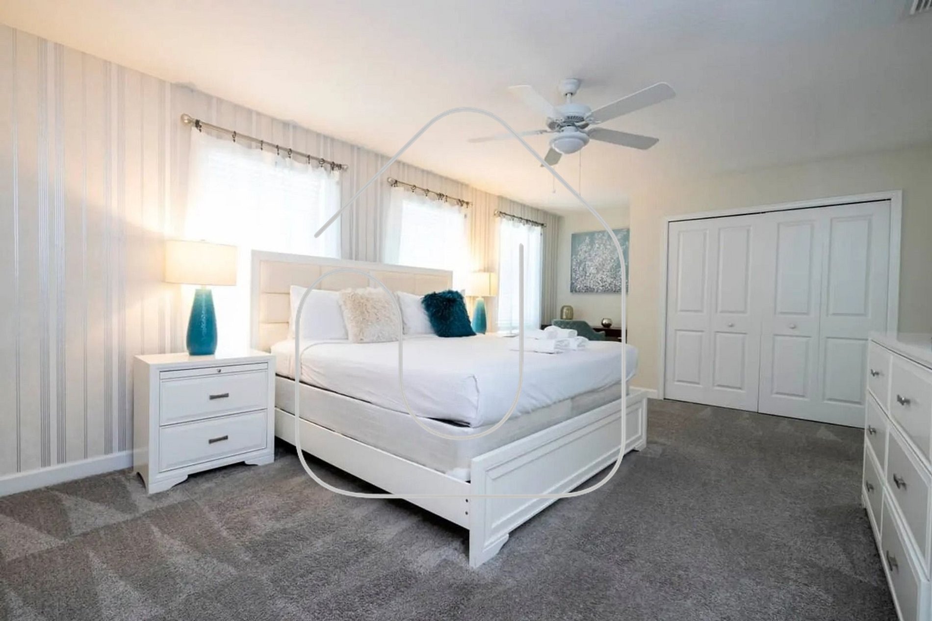 Guests have full access to the house, including all rooms, private pool, grill (for a fee), game room, and laundry. They also enjoy the amazing Storey Lake Resort amenities: pools, lazy river, gym, mini-golf, tiki bar, and more.
