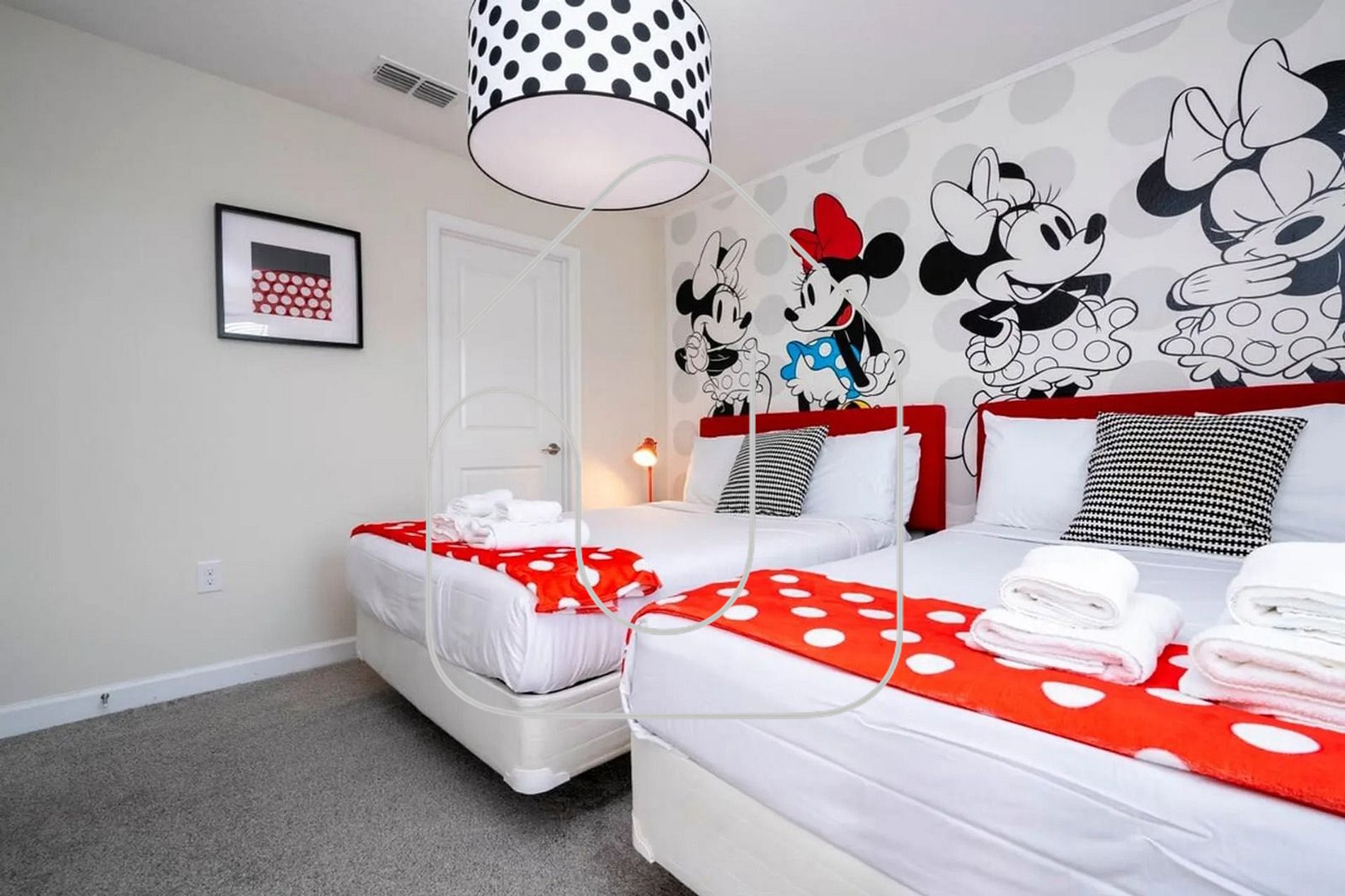 -1 Mickey-themed bedroom with two Full beds – colorful and fun for kids.