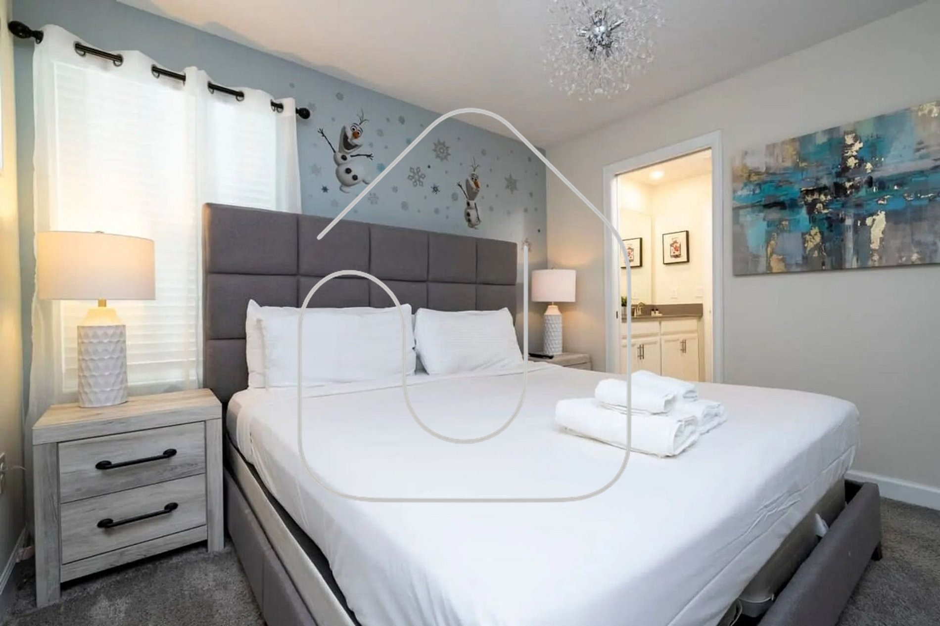 -1 Frozen-themed bedroom with Queen bed – perfect for Disney fans.