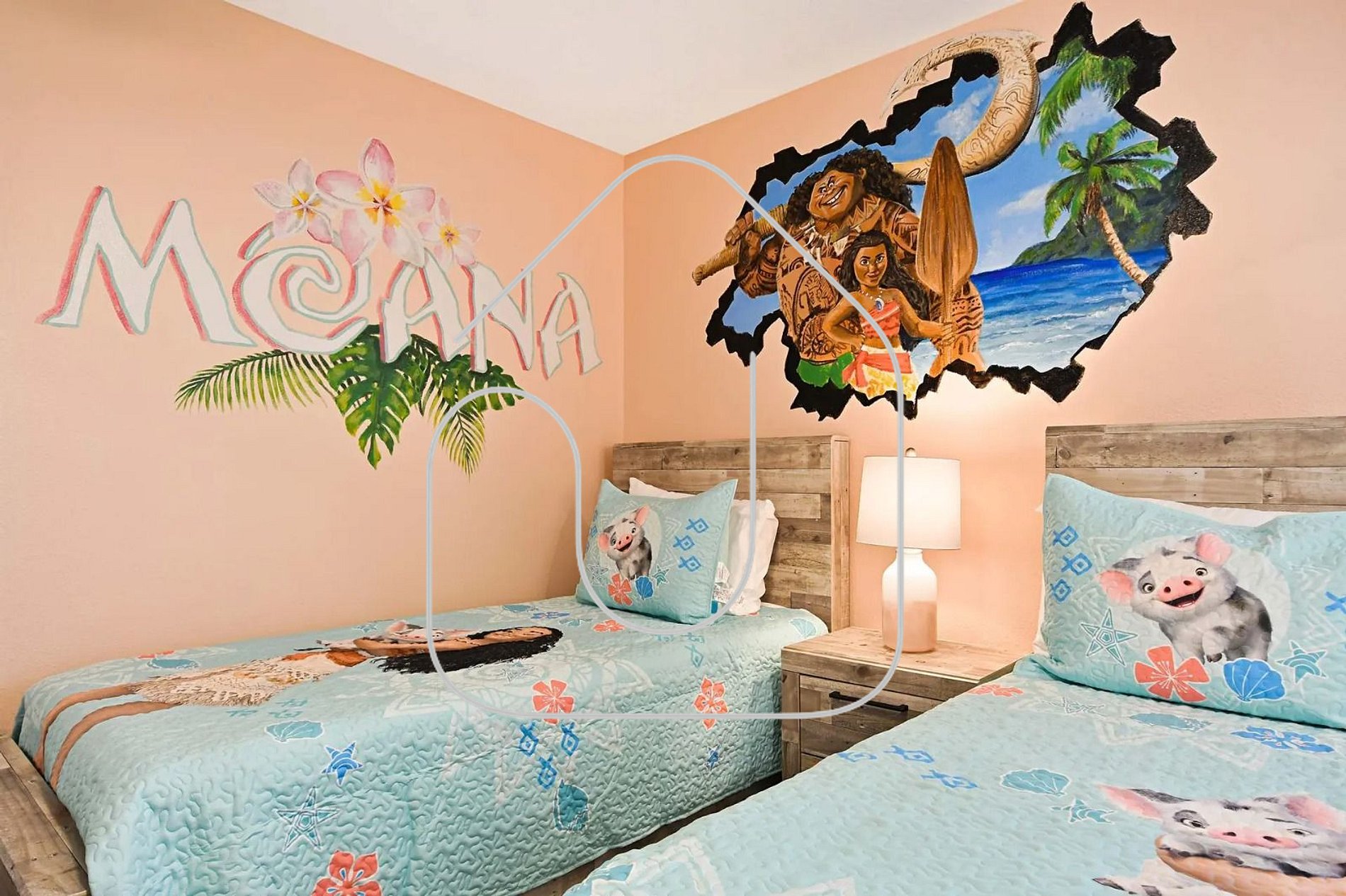 This magnificent 9 bedroom 5.5 bathroom villa at Storey Lake Resort accommodates up to 26 guests. Just 10 minutes from Disney, it combines space and style with magical touches like Moana and Frozen themed rooms and an Avengers game room. The private heated pool and outdoor seating area offer moments of relaxation, and guests can also enjoy a barbecue area for outdoor meals. Pool heating and BBQ grill use are available for an additional fee. Inside, the open layout connects the living room, dining area and fully equipped kitchen, creating the perfect environment for group gatherings. With access to resort amenities including clubhouse, lazy river, mini golf and sports courts, this home offers comfort, entertainment and convenience for a memorable Orlando vacation.