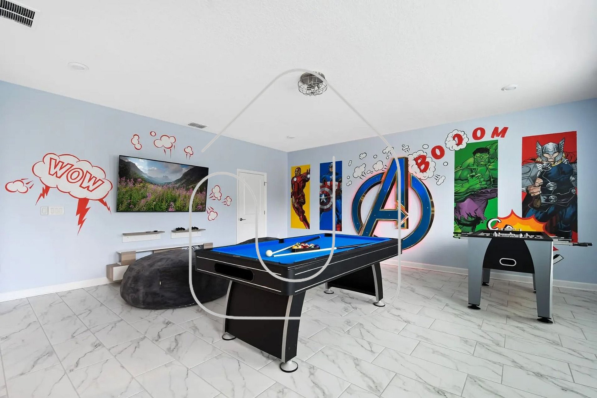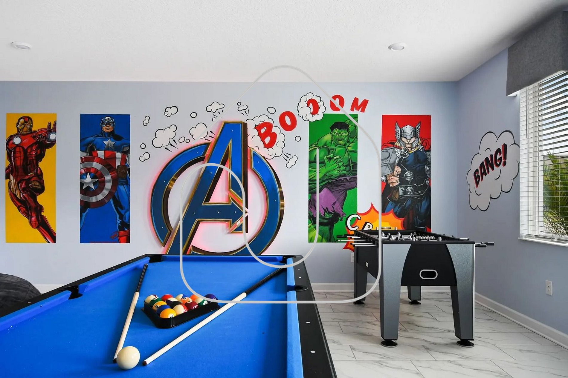 This magnificent 9 bedroom 5.5 bathroom villa at Storey Lake Resort accommodates up to 26 guests. Just 10 minutes from Disney, it combines space and style with magical touches like Moana and Frozen themed rooms and an Avengers game room. The private heated pool and outdoor seating area offer moments of relaxation, and guests can also enjoy a barbecue area for outdoor meals. Pool heating and BBQ grill use are available for an additional fee. Inside, the open layout connects the living room, dining area and fully equipped kitchen, creating the perfect environment for group gatherings. With access to resort amenities including clubhouse, lazy river, mini golf and sports courts, this home offers comfort, entertainment and convenience for a memorable Orlando vacation.