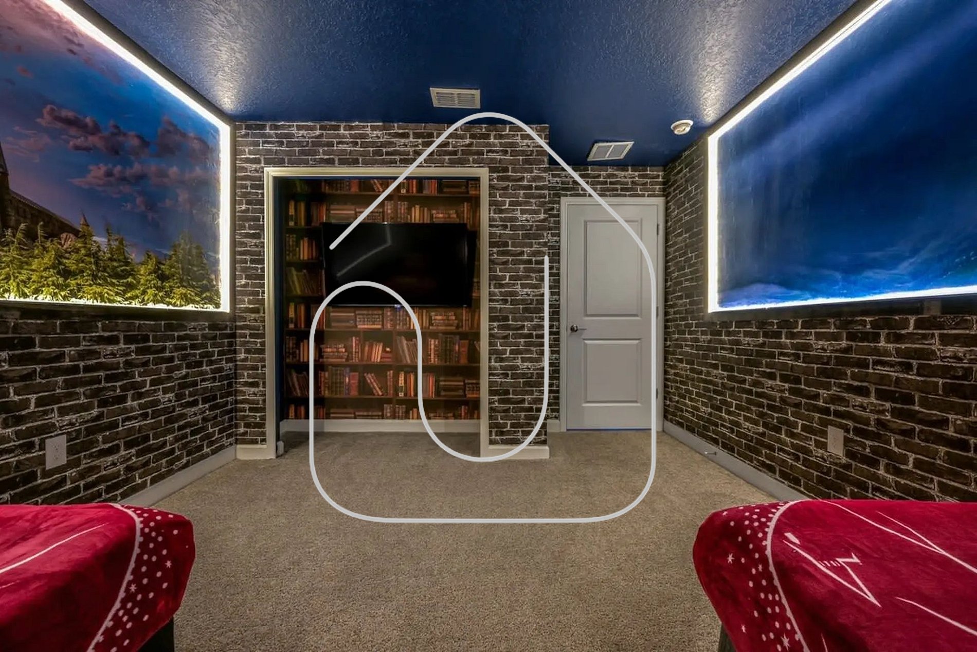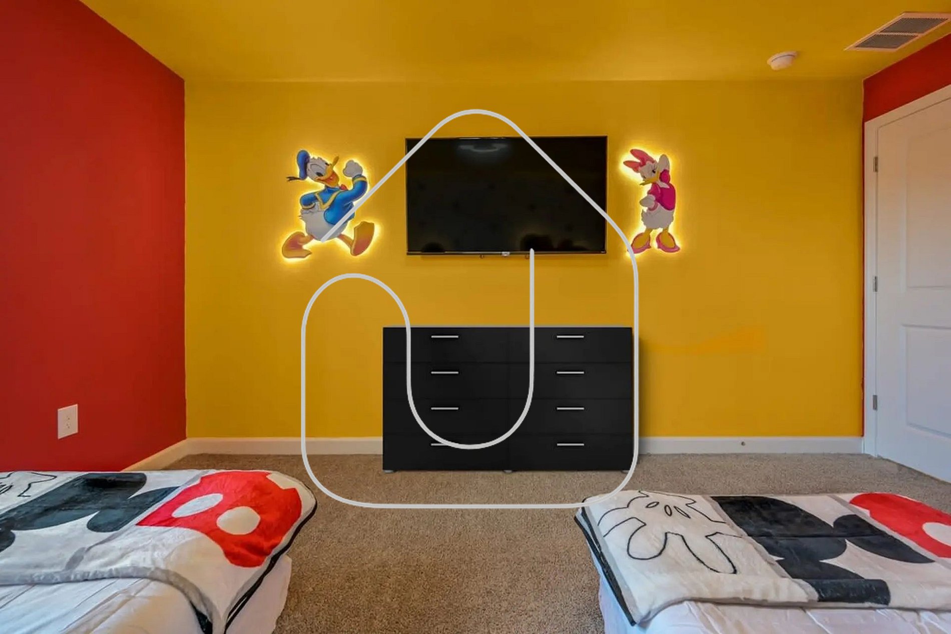 On the first floor, there's a bedroom with a queen-size bed and an adjacent bathroom — ideal for guests who prefer not to use stairs. Upstairs, you’ll find the master suite with a king-size bed and private en-suite bathroom, another queen bedroom, and two themed bedrooms for kids — one Mickey-themed and the other Harry Potter — each with two twin beds. These two rooms share a full bathroom, making them perfect for siblings or friends while still offering privacy.