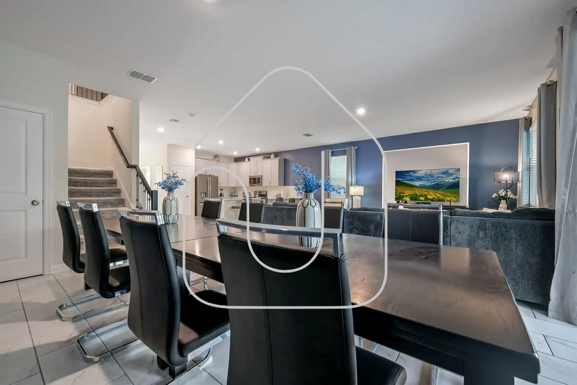 The home features an open-concept design with a spacious living area, elegant dining space, and a fully equipped kitchen with modern appliances—perfect for preparing meals and gathering together.