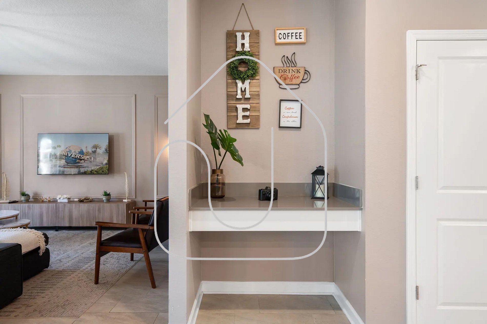The open-concept living, dining, and kitchen area creates the ideal setting for family gatherings. Relax in the elegant living room with plush seating and a large flat-screen TV, or enjoy meals together at the spacious dining table. The fully equipped kitchen features stainless steel appliances, granite countertops, and all the cookware and utensils needed to prepare anything from quick breakfasts to full dinners.
