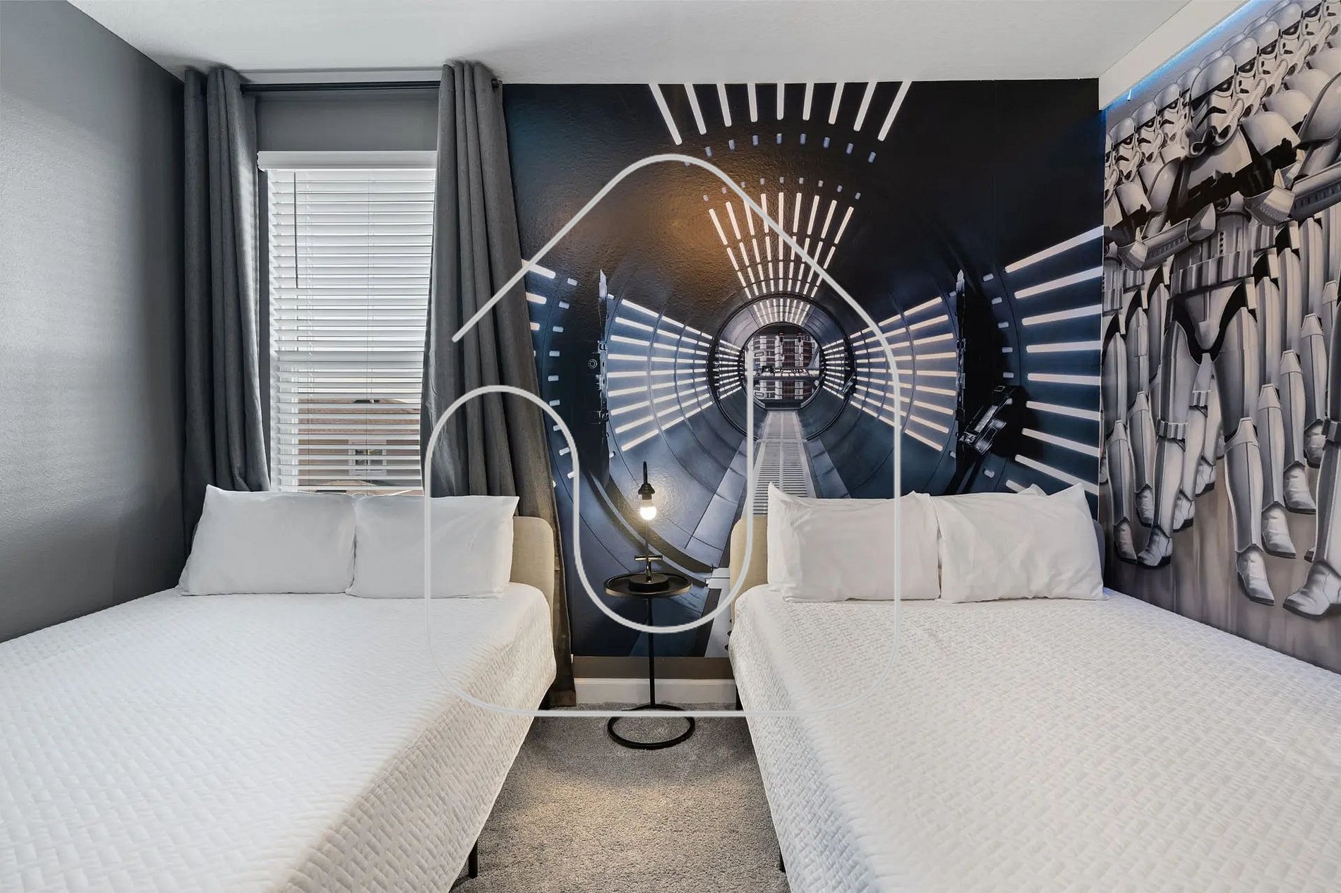 Bedroom 5 (Upstairs – Star Wars Theme): Two double beds, shared bathroom