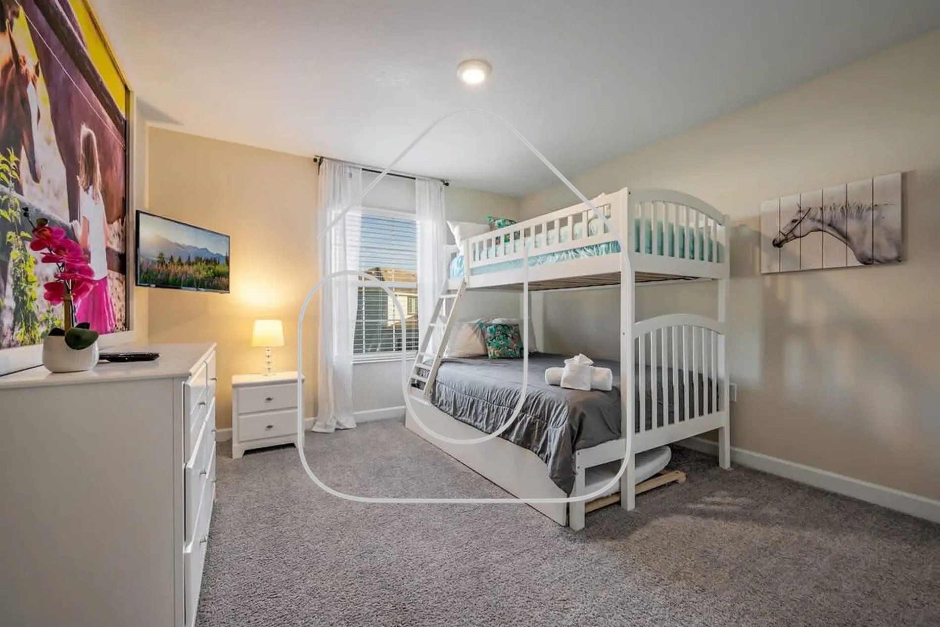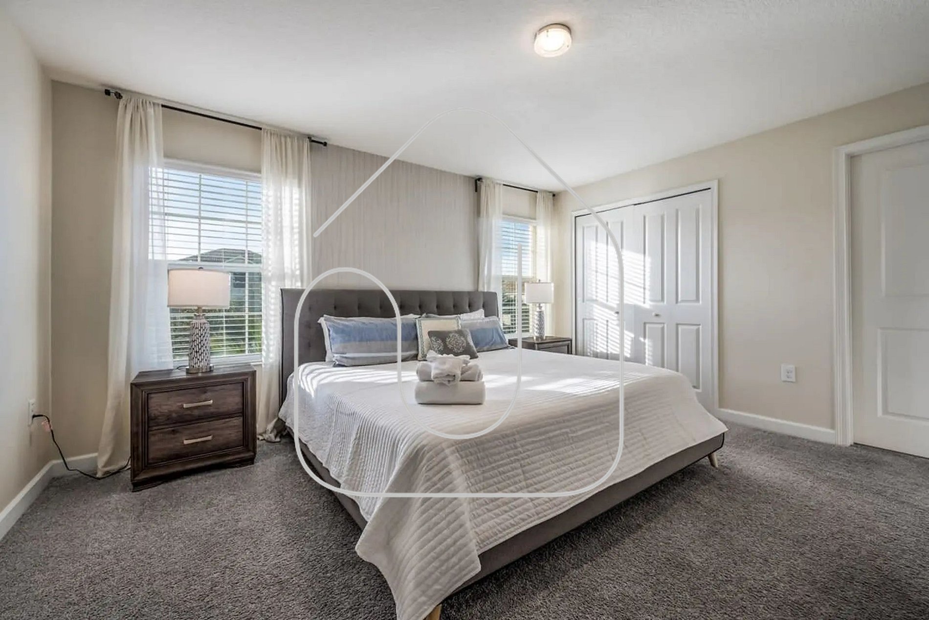 Indulge in the charm of this modern 4-bedroom, 3-bath townhome at Champions Gate Resort, accommodating up to 11 guests. Perfect for families, it features spacious living areas, a fully equipped kitchen, and themed bedrooms for kids. Relax in your private pool or explore resort amenities including pools, lazy river, waterslides, fitness center, golf course, and more. Ideally located just 20 minutes from Disney and close to Universal, SeaWorld, dining, and shopping.