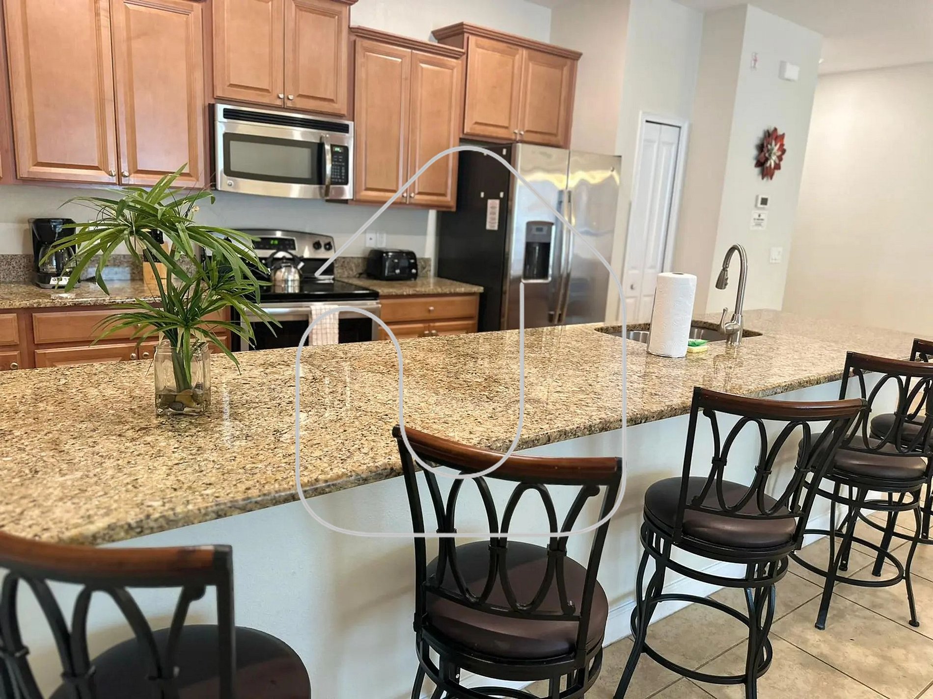 This spacious 4-bedroom, 3-bathroom townhome at Storey Lake Resort is thoughtfully designed for comfort and relaxation. The open-concept layout seamlessly connects the inviting living room, dining area, and a fully equipped kitchen—perfect for family meals or entertaining after a day at the parks.