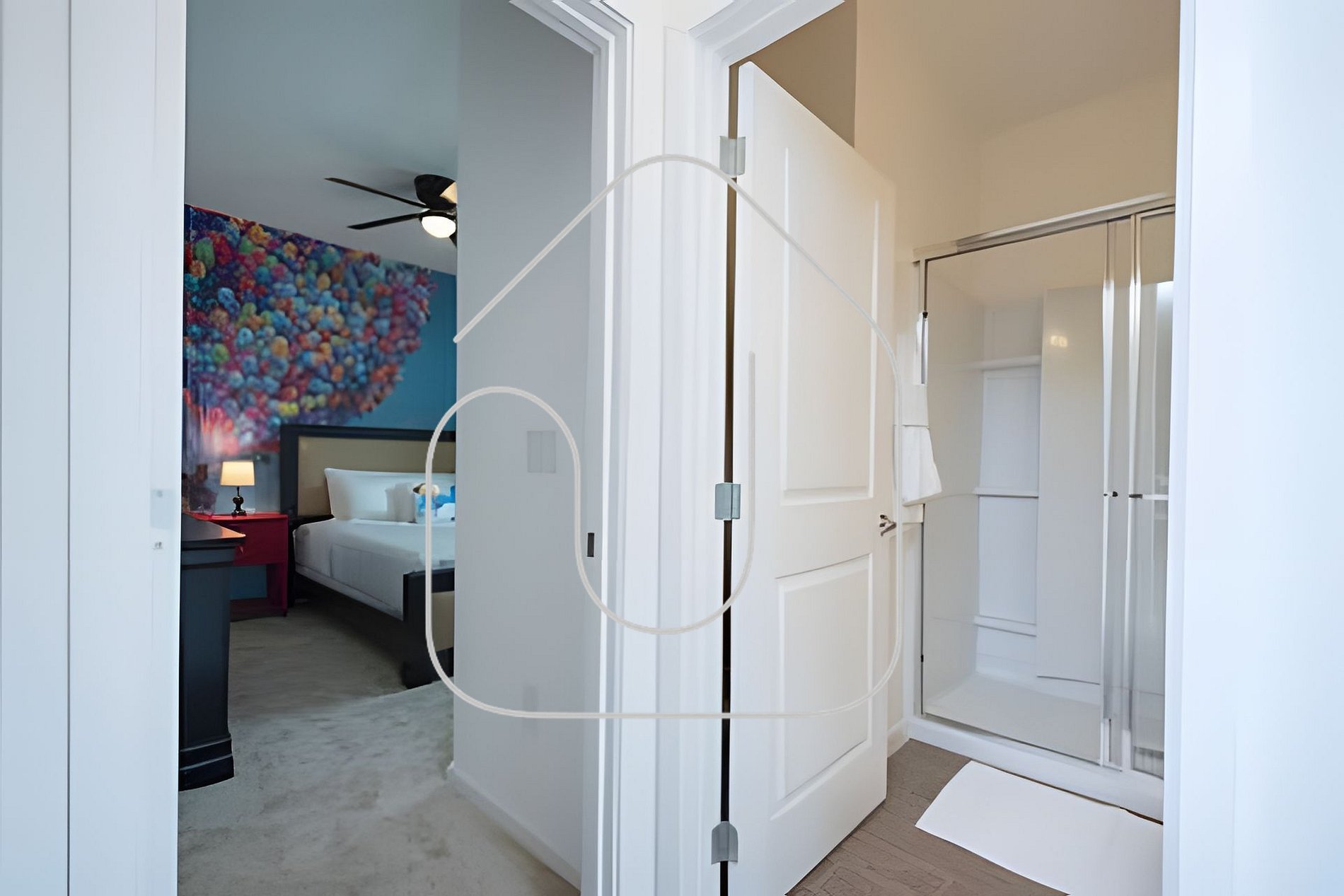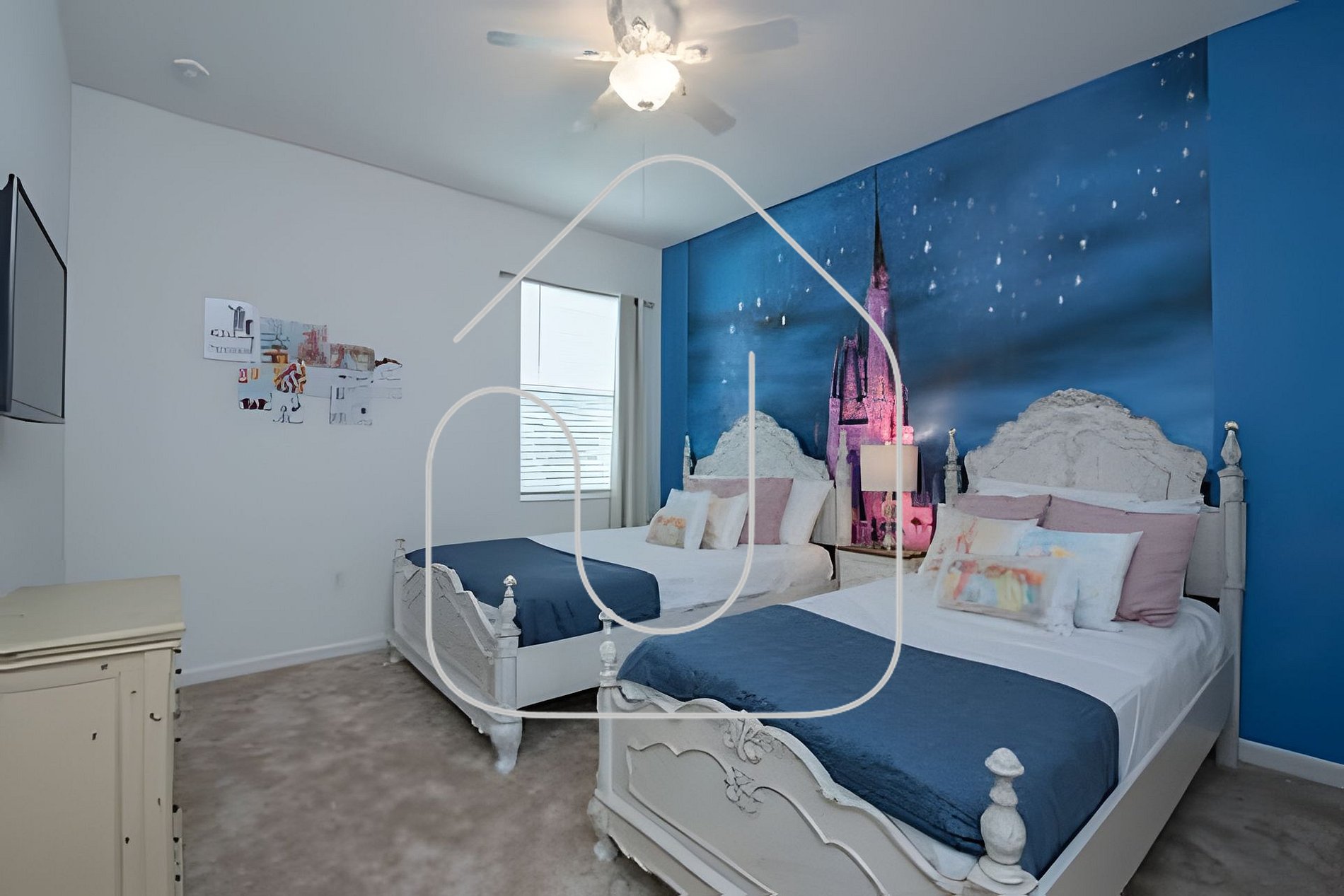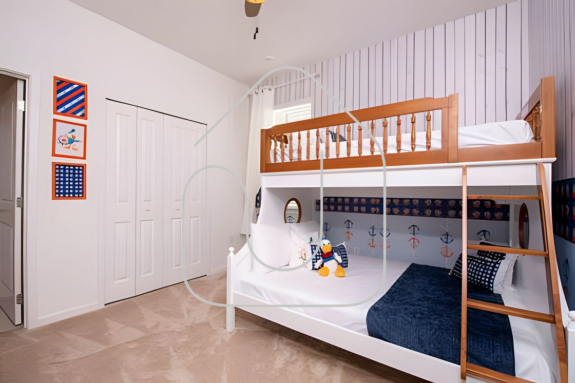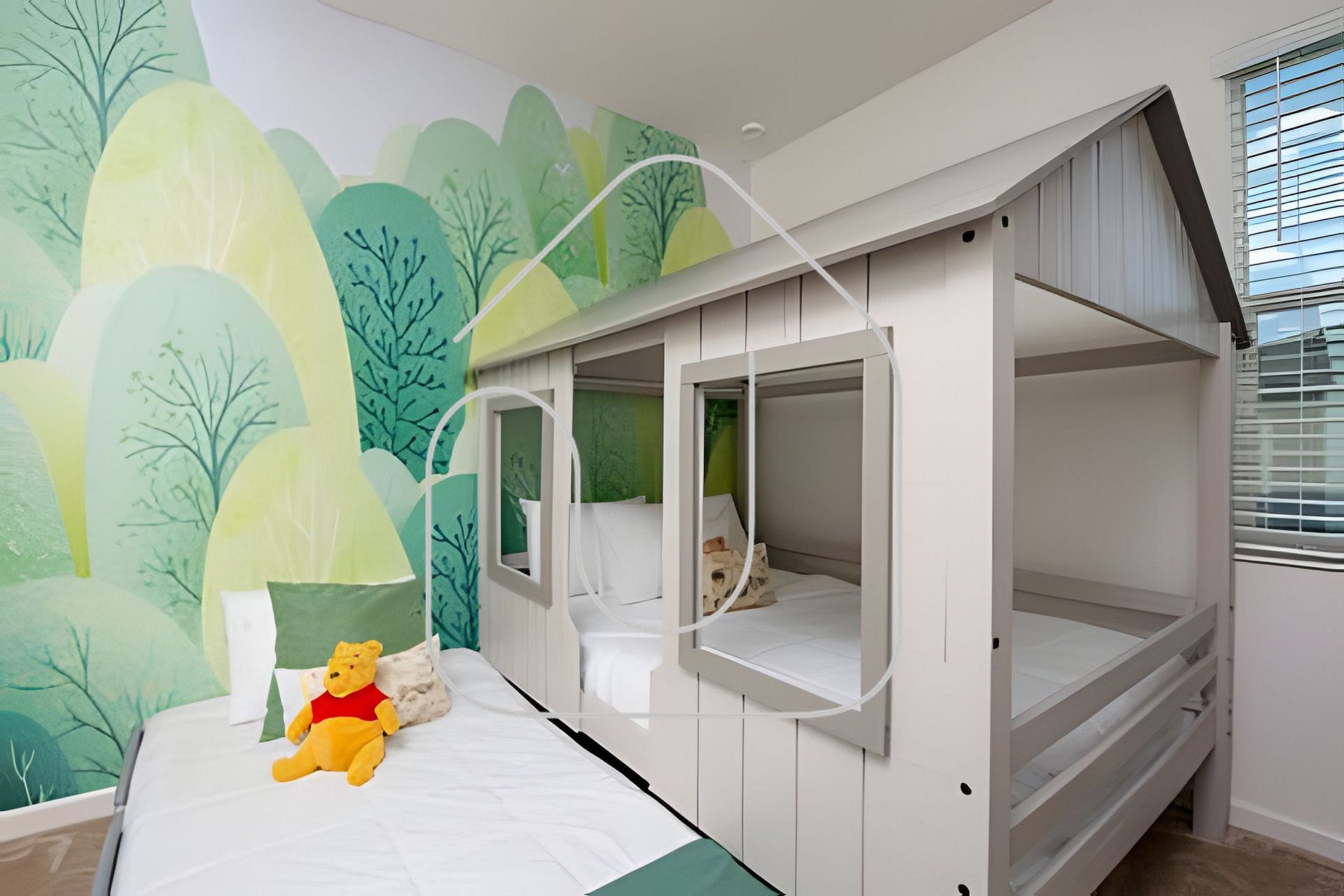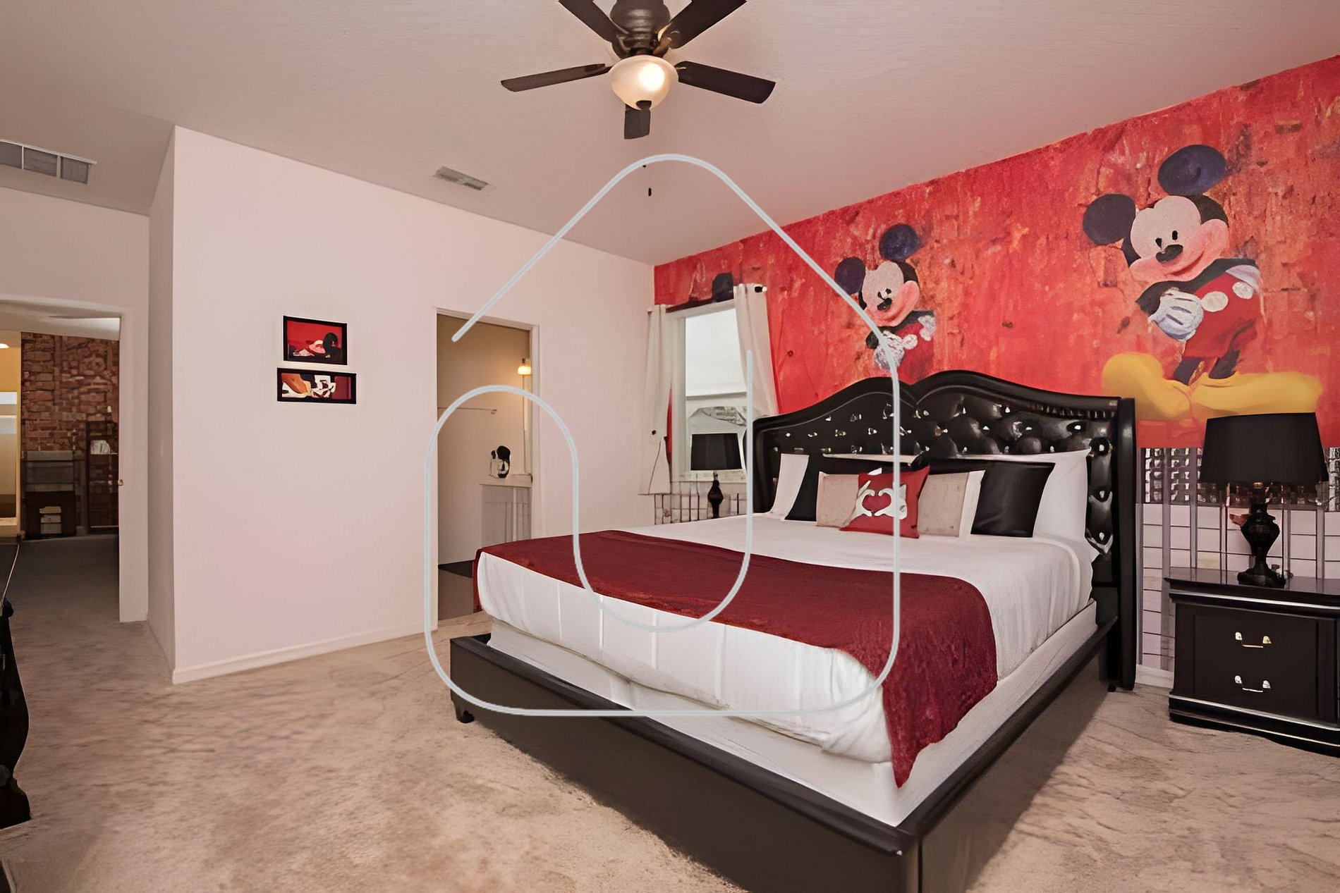 Each of the nine bedrooms features a unique and playful theme including Lion King, Star Wars, Mickey, Toy Story, and more creating a magical experience for guests of all ages. The home is perfect for large groups, offering a variety of bed arrangements such as bunk beds, queen, full, twin, and king-size beds for maximum comfort.