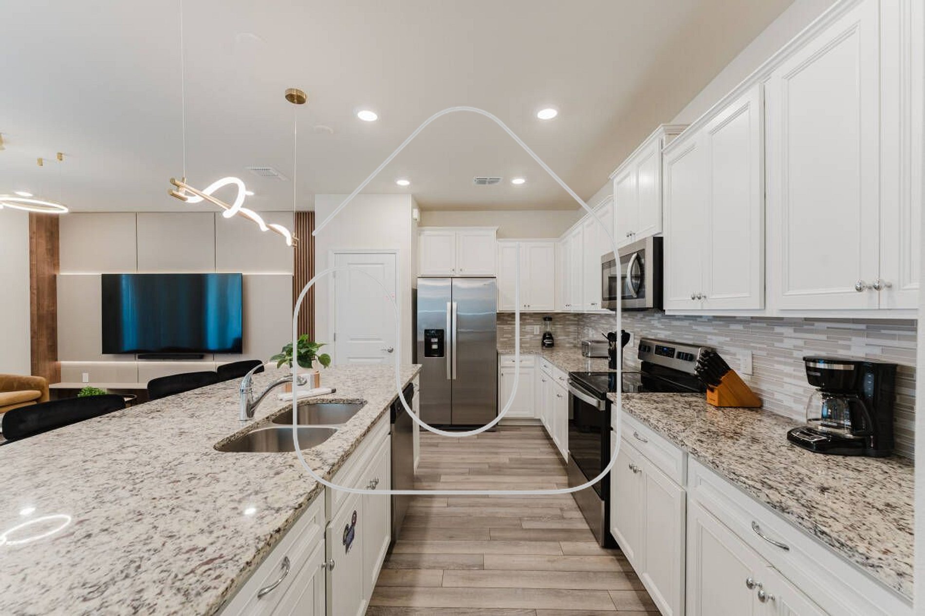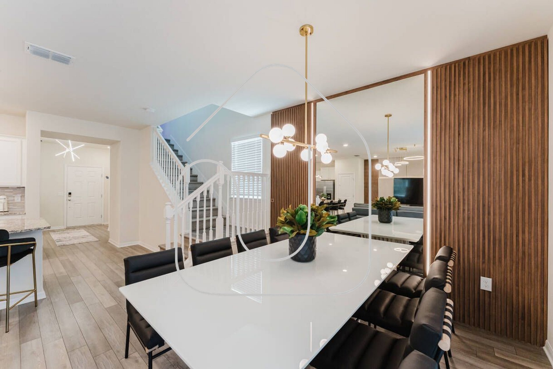 Professionally furnished two‑story home with 5 bedrooms and 4.5 bathrooms, spanning 2,265 sq ft of luxury. On the ground floor: open family room with LCD TV, dining table for 8 plus breakfast bar for 4, and fully equipped kitchen.
