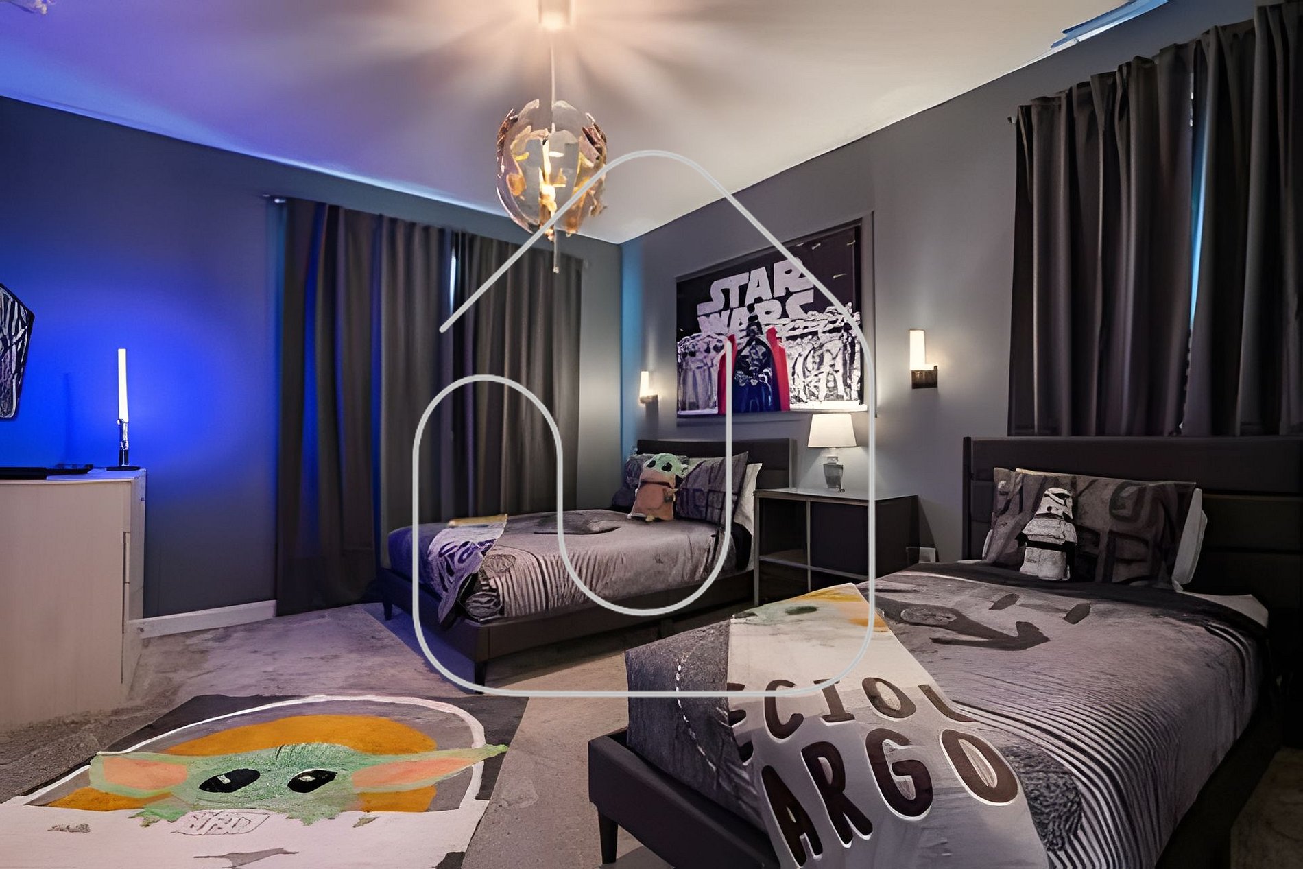Star Wars Room (Sleeps 3): Outfitted with one double bed and one twin bed, this room immerses guests in a galactic adventure, perfect for kids, teens, or any Star Wars enthusiast.