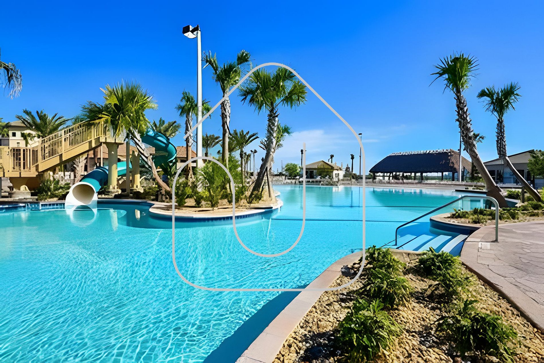 Expansive water park with lazy river, water slides, and kids’ splash zone